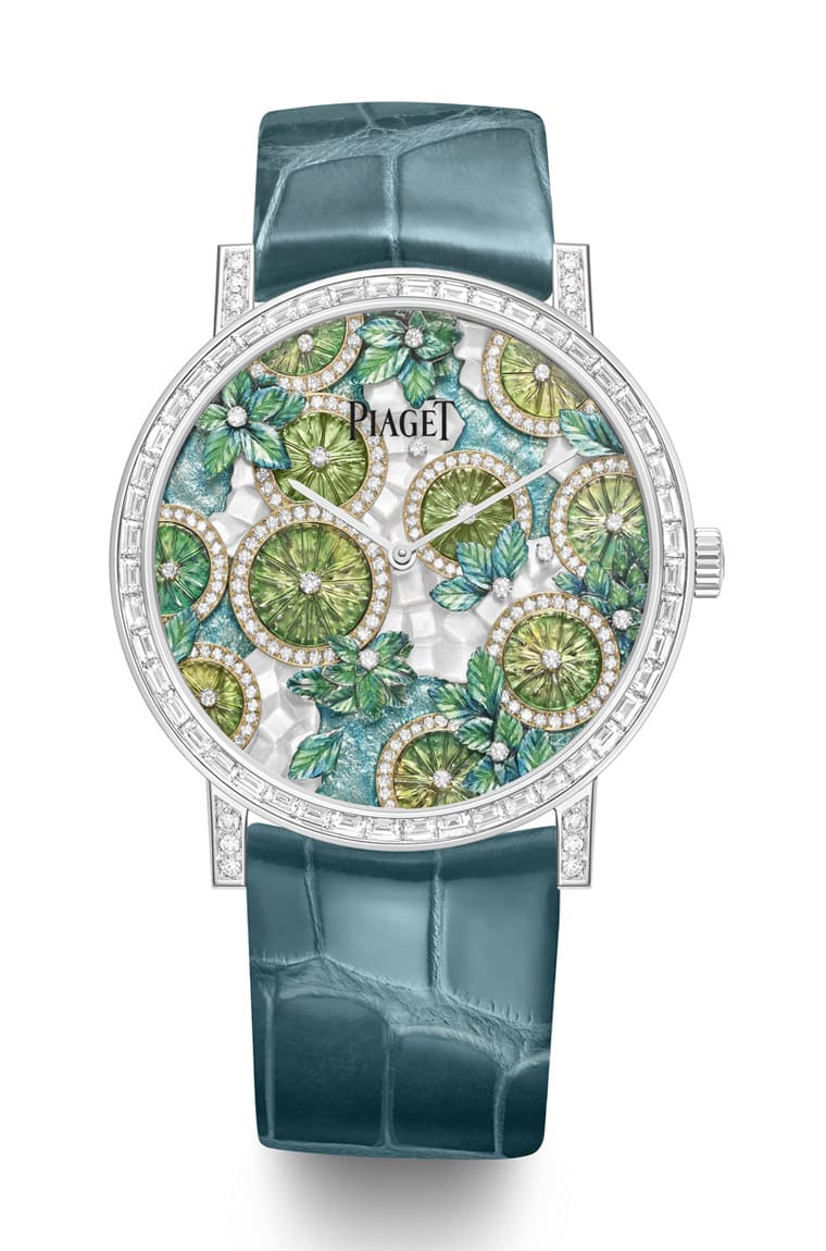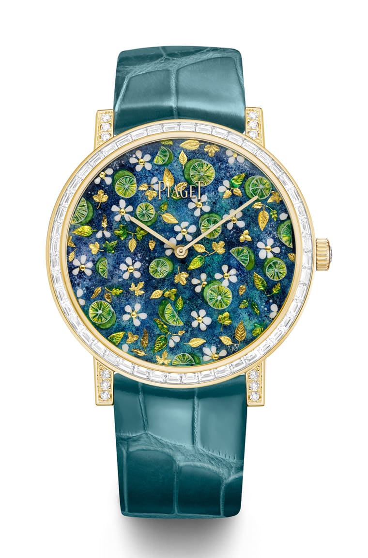 在第二篇章的部分,伯爵打造出Joyful Sharing腕表这款作品,它是世界顶级珐琅大师Anita Porchet和荷兰雕刻大师Dick Steenman共创的成果,错综而繽纷的面盘令人联想到鸡尾酒丰富的杯中物,Dick Steenman在经过雕刻的珍珠母贝底板上对宝石进行精雕细琢,创造出熠熠生辉且活泼生动的青柠檬片和薄荷叶。Anita Porchet接着为这些雕刻好的元素覆上以半透明珐琅制成的薄荷叶和冰块,展现出栩栩如生的效果。