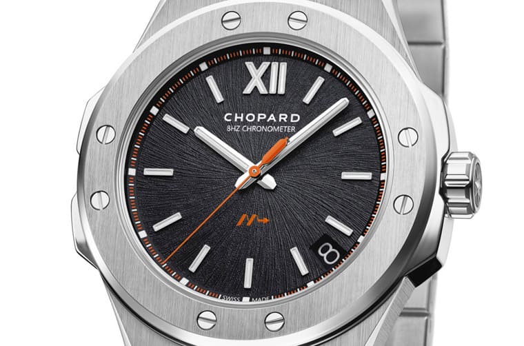萧邦2023年重新替表款挑选面盘顏色,面盘本身的特殊纹理——从老鹰虹膜取得灵感的造型是此系列问世后令人印象深刻的招牌特色,此次品牌选择採用黑色面盘重新诠释,面盘外围的刻度、秒针、6点方向的箭头标志(代表着高震频规格)纷纷改成与黑色呈现高度对比感的橘色,就连12点方向的品牌标志与天文台认证字样等,也从前作的黑色变为白色,连同4~5点方向的日期窗下方转盘也改成黑色底色,以上这些细节都与前作银灰色面盘有别。
