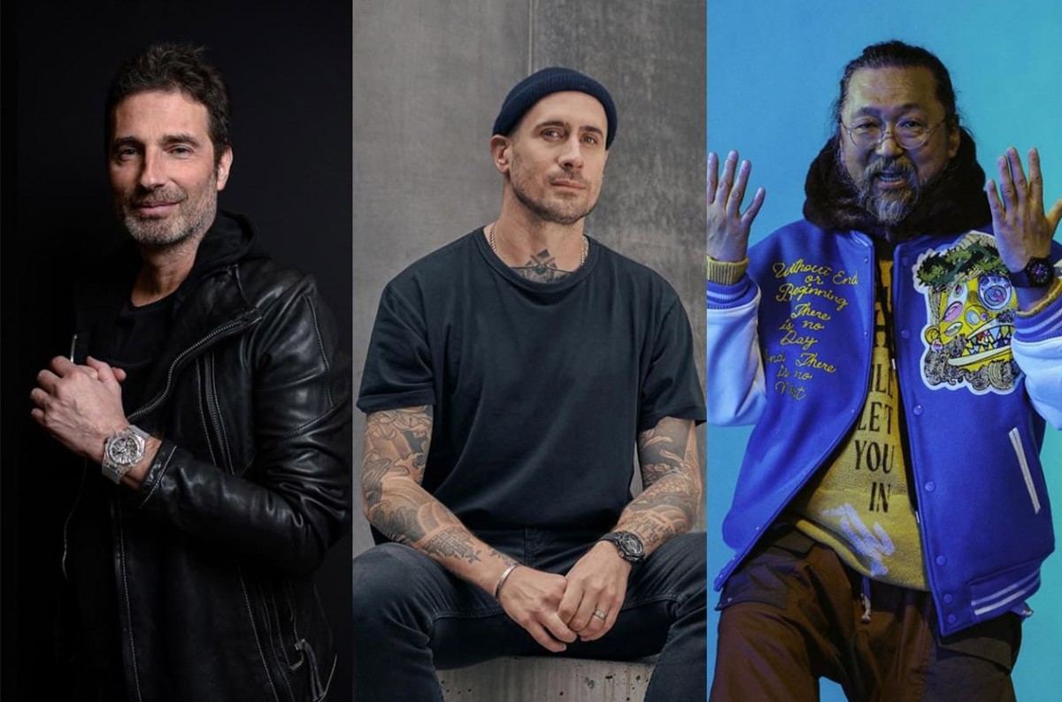 ▲左起为宇舶品牌艺术大使Richard Orlinski、Maxime Plescia-Büchi与村上隆,他们皆在艺术界佔有一席之地。