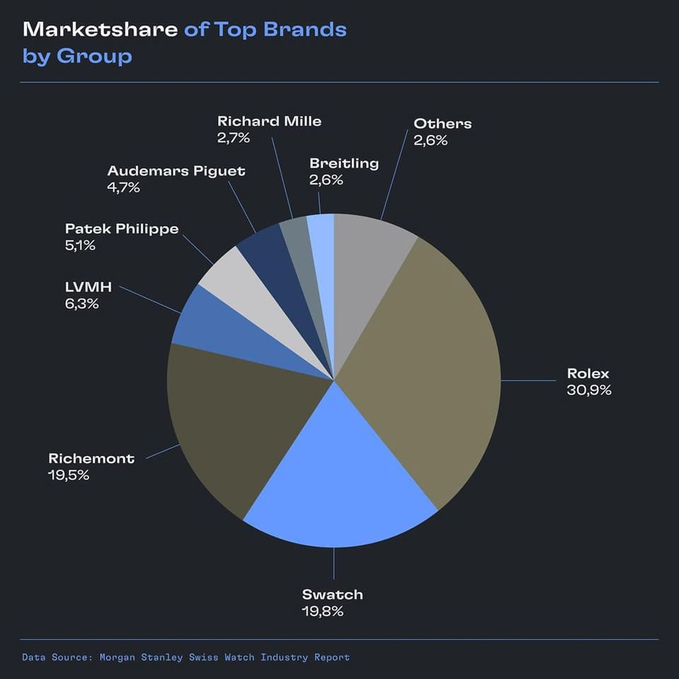 而如果把格局拉高到品牌与集团的市场分额,那麼2022年市场佔比最高的前五名依序是劳力士(30.9%)、Swatch集团(19.8%)、Richemont集团(19.5%)、LVMH集团(6.3%)与PP(5.1%),看起来集团还是有团结力量大的效益。不过整体而言,目前的瑞士钟表产业还是一个两极化严重的发展,少数品牌加起来的销售额佔整体销售额极高的比例,这种现象还是延续着前几年的趋势不变。