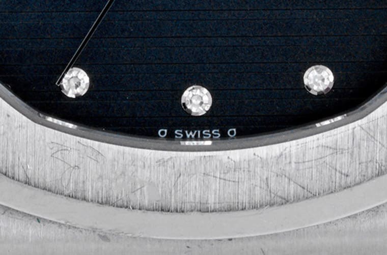 ▲面盘6点方向的”SWISS”字样两旁印上σ符号,代表面盘上有零件以贵金属制成。Source:Chiswick Auctions
