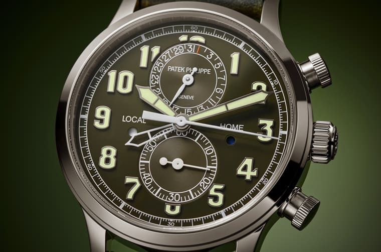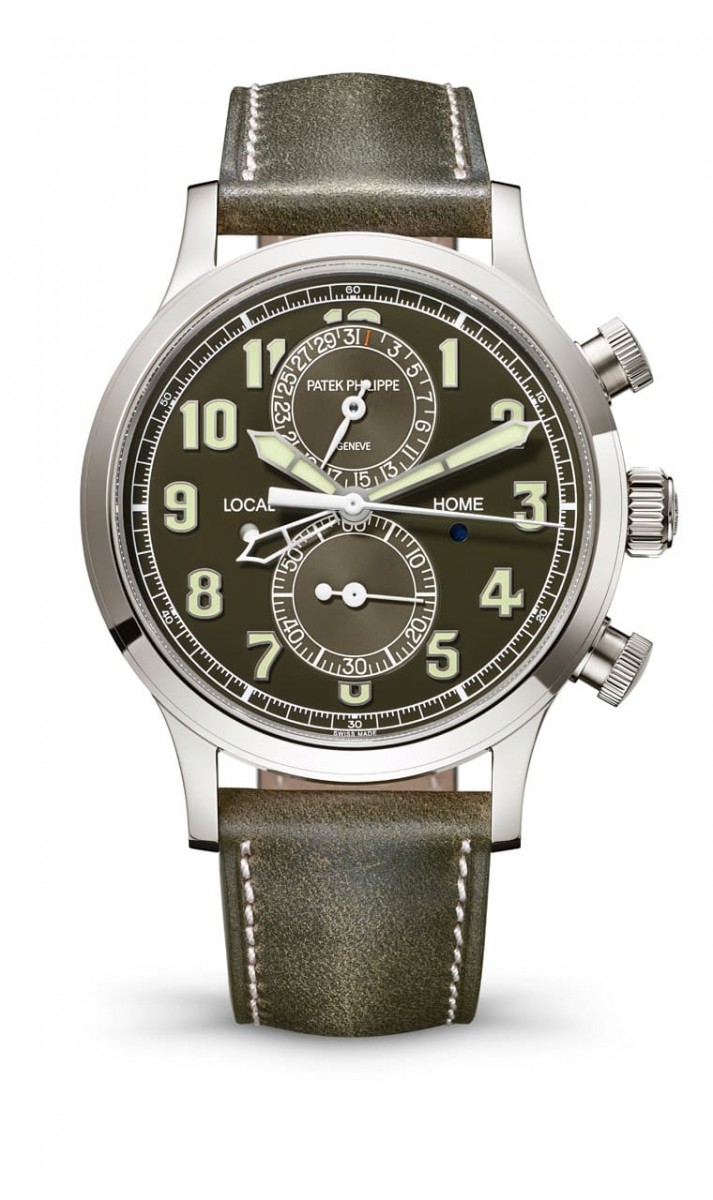 Complications 5924G延续系列的传统以贵金属——白金材质制作表壳,表径42mm也是PP这个飞行表系列的标准尺寸,而且品牌分别推出了蓝灰色太阳放射纹面盘的5924G-001,以及卡其绿漆面面盘的5924G-010两款,前者配上粒纹深蓝色小牛皮表带、后者则是搭配橄欖绿色小牛皮表带,表带外观带有做旧效果。这款新作有个比较明显的变化在于原本设置在表壳左侧的快调按把被移到了面盘右侧,由于手表新增了飞返计时码表功能,因此PP此举显然是将按把转为操控计时功能之用,转到表壳左侧会发现在8点和10点位置也多了两枚隐藏式按把,透过品牌随附的调校针,前后快调所在地时针还是可以很便利快速。