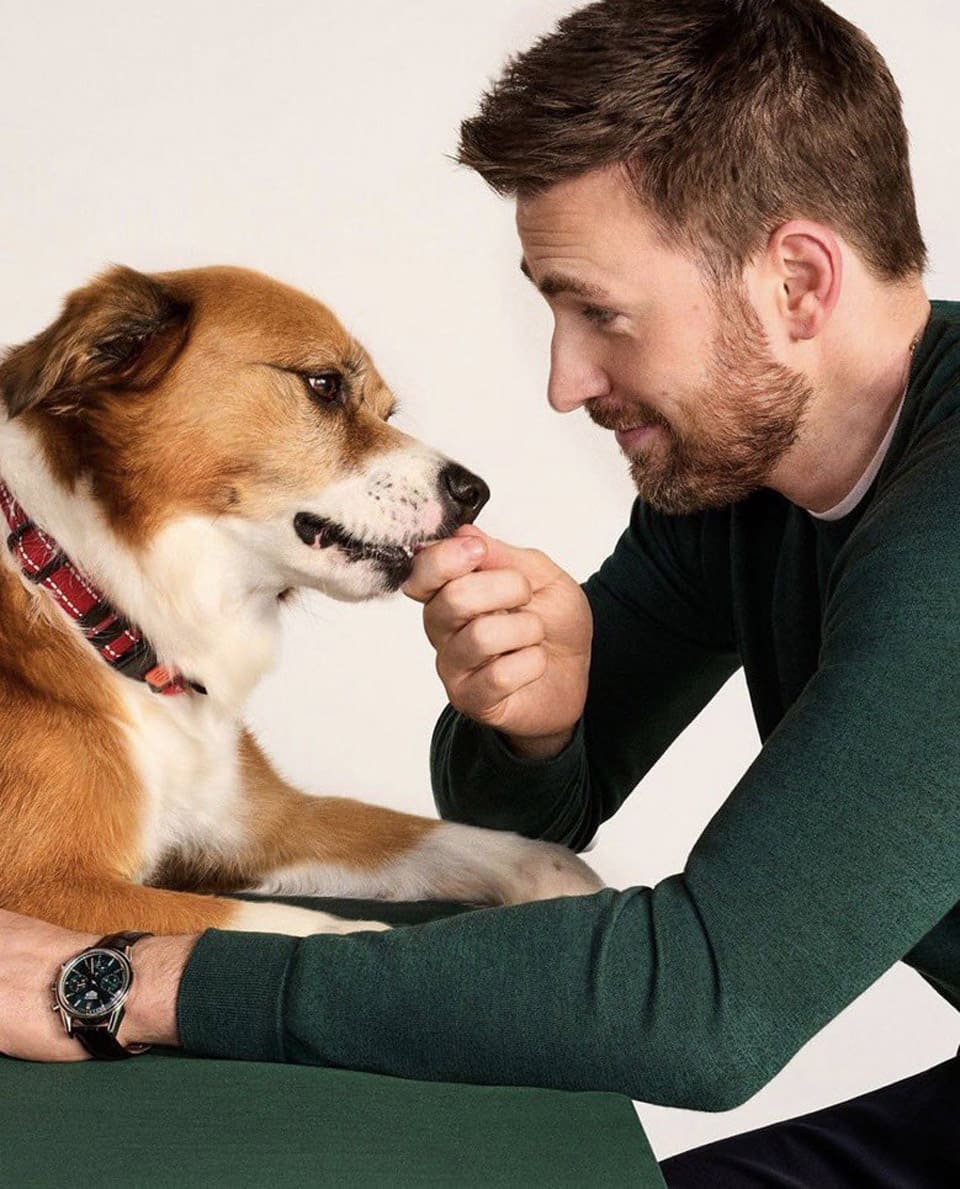 ▲克里斯伊凡佩戴泰格豪雅前两年推出的Carrera绿面限量自动计时码表与爱犬拍摄广告。