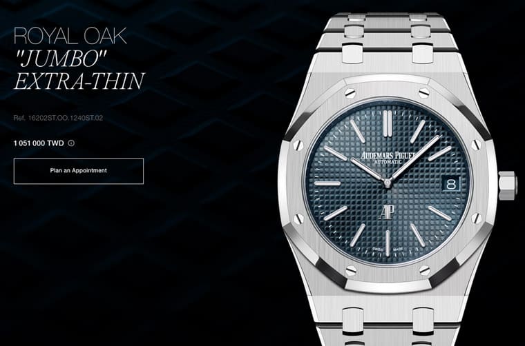 根据高级手表市场调查研究机构WatchCharts公布的资料,16202ST.OO.1240ST.01的国外定价是33,200美金,当它在2022年首度进入二级市场时,行情超过了28万美金,溢价率是不可思议的820%,不过因为2022年第2季之后高级手表市场的价格整体都往下掉,皇家橡树Jumbo超薄二针款也陆陆续续有更多货进入二级市场,各种元素交织后导致手表的身价从一开始的高峰一路往下掉,发展到2022年10月,表款的行情已经降至12万多美金,比起刚出道时直接砍半。