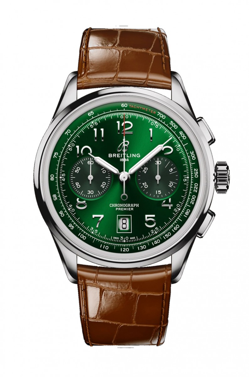 ▲传承早期飞行表底蕴的Premier B01 Chronograph 42计时码表换上绿色面盘,融合新旧时代的特色引人注目。