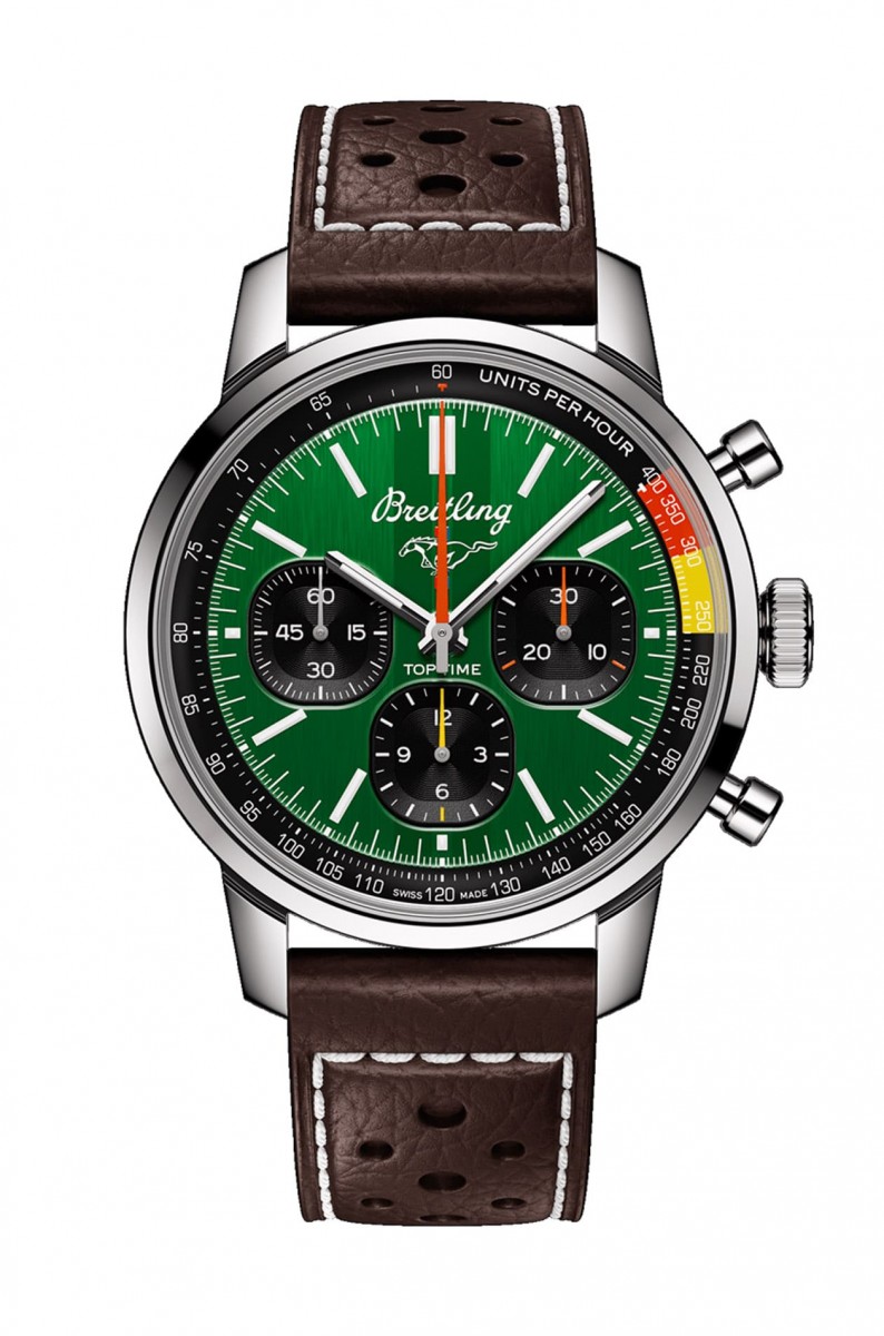 Top Time B01系列福特野马特别版同样是一款绿色面盘的计时码表,不过腕表的设计渊源和Premier系列明显有别,百年灵重新诠释1960年代为了汽机车爱好者研发Top Time腕表,品牌以不锈钢材质制作表壳,表径41mm大小适中,并能搭配复古风强烈的穿孔皮带或不锈钢米兰链带传达复古个性。百年灵甚至找上知名车厂如FORD、CHEVROLET等合作,以经典跑车为主题,开创出一系列独具竞速DNA的赛车腕表。
