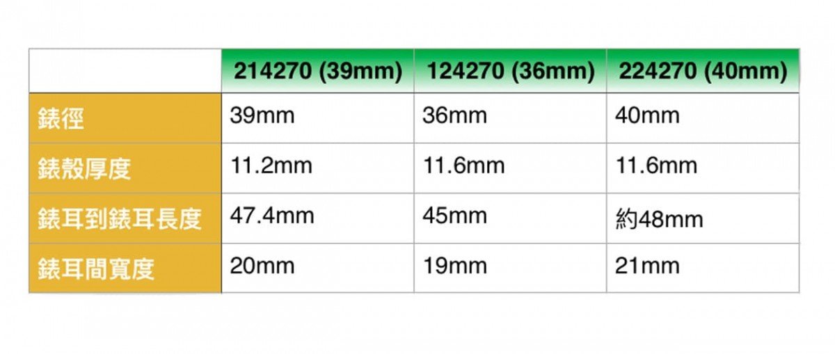 由于214270已经停产,因此如果现在刚开始锁定探一,要烦恼的其实是要选124270还是224270,两款表设计一样、机芯一样,功能也一样,连定价也没差多少(224270定价贵14,000台币),所以完全就是视大家对表径大小的习惯与需求,国外媒体Monochrome-watches很贴心地将两种型号的上手照放上网,让大家不一定要亲自接触实表也可以感受看看实着图的氛围,从中对照自己喜欢手表戴在手上呈现的比例和感觉如何,你会发现同样的设计与面盘格局,改採不同表径戴在手上却会衍生同中求异的感受,实在满有趣的。最后一併附上同样由Monochrome-watches提供的探一三种型号各方面的尺寸对照表,让你在进行比较时更有所依据。