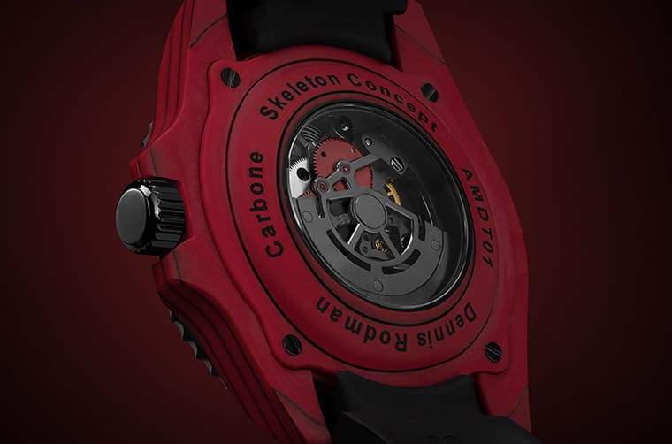 ▲The Dennis Rodman Concept改成红色碳纤维表壳搭配黑色橡胶表带,镂空面盘也充满了改装表品牌的设计巧思,如9点方向时标旁多加了数字1,与罗德曼在公牛队时期的背号呼应。Source:SKELETON CONCEPT