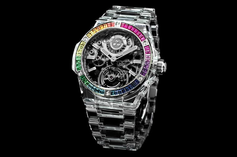 宇舶近年陆续推出过数款採用蓝宝石表壳的Big Bang自动陀飞轮,C罗拥有的这款以无色透明的蓝宝石制作表壳与链带等零件,并在表圈镶上带有渐层效果的彩色蓝宝石,而其实宇舶曾在2021年先后发表过在白金或皇金表壳镶上满满彩色宝石的Big Bang Integral Tourbillon Rainbow,以及完全採用无色透明蓝宝石打造表壳、链带的Big Bang Integral Tourbillon Full Sapphire,C罗佩戴的款式有点像是综合前述两款的特色,不过这款表品牌只曾经在Youtube放上一支介绍影片,印象中没见过品牌释出产品相关资讯,目前在他们的官网上也找不到这款表,带有点神祕色彩。论奢华程度这款Big Bang透明彩虹圈自动陀飞轮没有先前那只白金全彩虹款式高,可是单就稀有程度和特别度来说,C罗手上的这只着实已经够惊人,闪闪亮亮的设计很符合这位超级收藏家向来的喜好。