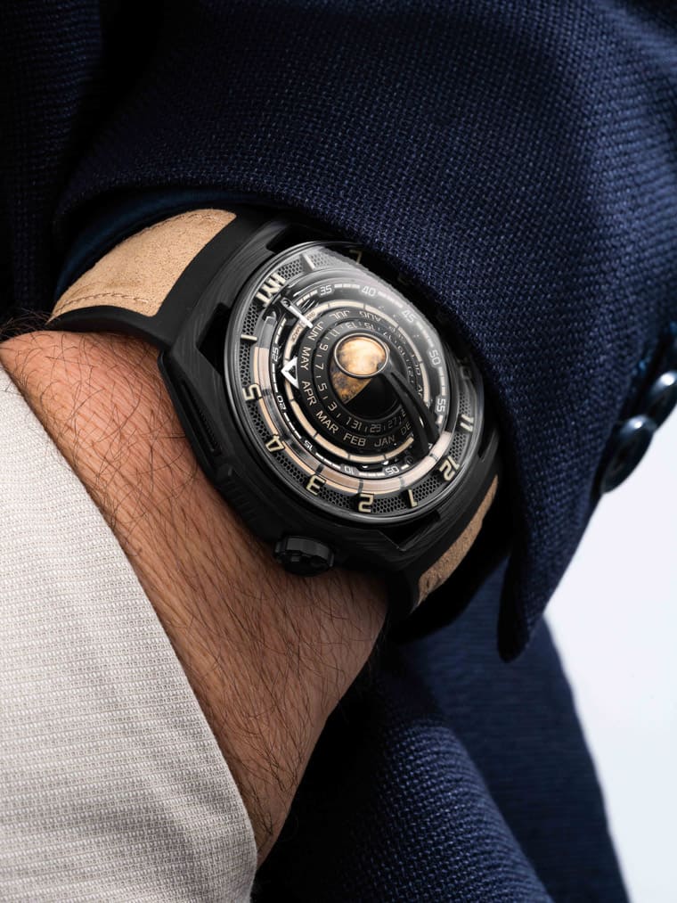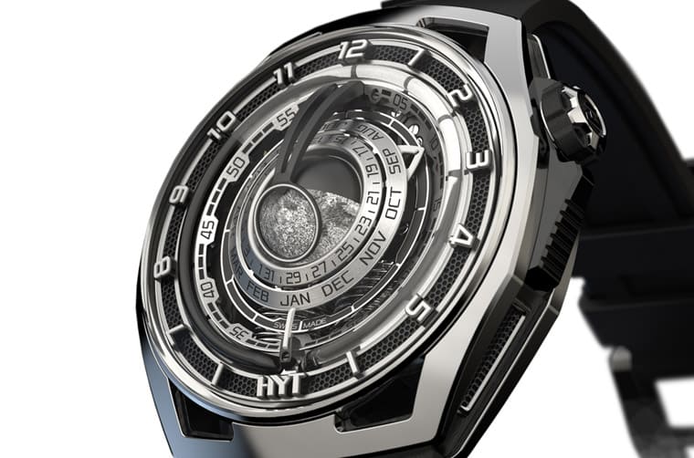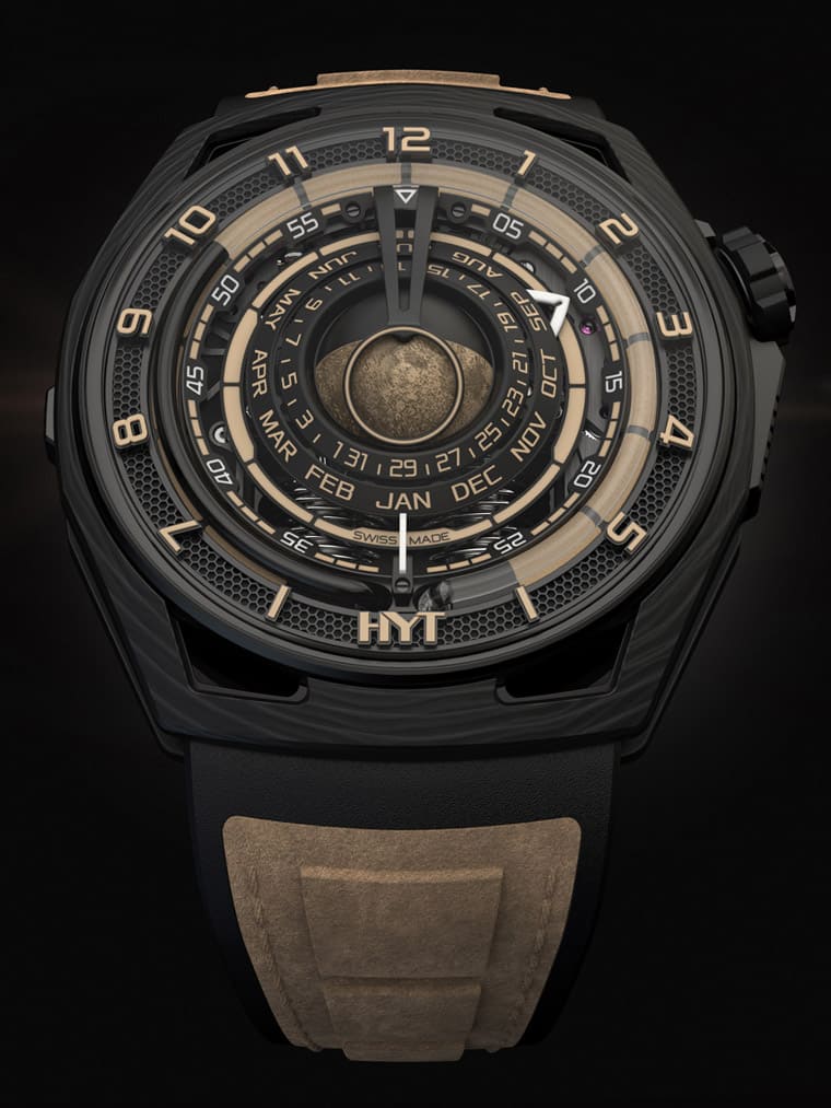 Moon Runner “Ghost”的表壳以碳纤维和钛金属制作、Moon Runner “Desert”的表壳则为碳纤维与黑色DLC钛金属材质,并分别搭配黑色与棕色表带,表带顏色与面盘带有互相呼应之感。手表的面盘结构突破传统造型显得格外立体细致,除了面盘中央有相当明确的月相显示,判读手表的时间资讯还必需先适应一下HYT自成一格的设计。包括月相显示外围有着日期和月份转盘,透过12点方向的镂空指标可以窥见当前日、月资讯,而在日期与月份下方设有一枚大型白色三角指针,搭配指针外缘的60个刻度指示分钟资讯。包括分钟刻度、指针以及日期与月份刻度、指标都涂有Super-LumiNova®夜光物料,在暗处读时完全没有问题,另外手表的小时资讯则是靠着HYT名闻遐邇的微流体装置以逆跳形式呈现。