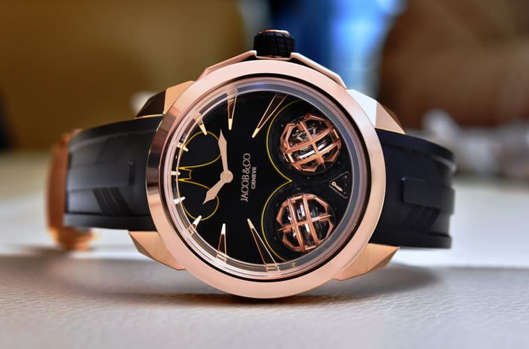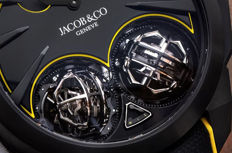 Gotham City腕表外观特徵如带有立体切面的表耳,令人联想到蝙蝠侠的面具,而表冠外部包覆的黑色橡胶则是做成轮胎造型,犹如从蝙蝠车取下的元素。腕表面盘上半部设有一枚酷似蝙蝠徽章的装饰,此处由一块黑色玛瑙切割而成,再经过拋光处理塑造出图案的光泽感,蝙蝠徽章边缘涂上黄色SuperLumiNova夜光物料勾勒,使其轮廓变得更为鲜明。JACOB & CO.分别在面盘1~4点以及8~12点方向设有长短不一的立体几何造型时标,愈靠近面盘下半部两枚三轴陀飞轮的时标长度愈长,因此时标乍看也有点像是蝙蝠徽章发出的光芒线条,吸引人自然将视线聚焦于面盘。