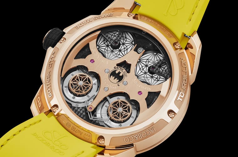 Gotham City腕表背面也会视表壳材质而有变化,其中黑色DLC版本为有图案的蓝宝石镜面,JACOB & CO.以雷射技术蚀刻出蝙蝠侠的上半身肖像、蝙蝠徽章以及品牌Logo等,黄底黑色造型与蝙蝠侠漫画风格一致;玫瑰金版本底盖则是传统的透明设计,佩戴者得以一窥JCFM10机芯风采,品牌设置了一枚大型玫瑰金蝙蝠形基板,至于蝙蝠轮廓餘下的四个角落则呈现工整对称的格局,展现品牌周到的设计思维。