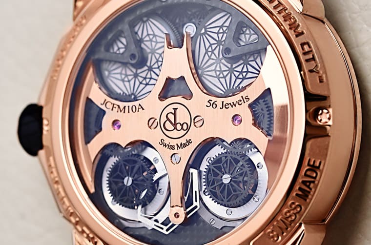 ▲玫瑰金版本以透明底盖露出JCFM10手上链机芯的样貌,表背设计同样呼应蝙蝠侠主题,并且强调对称和谐的格局。
