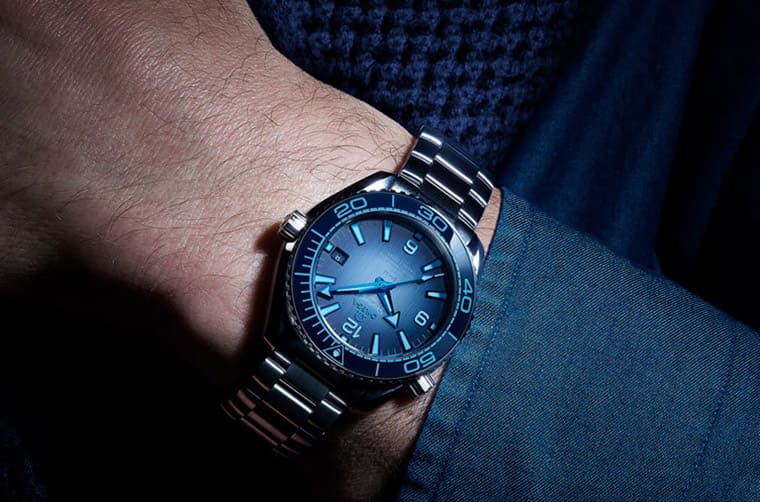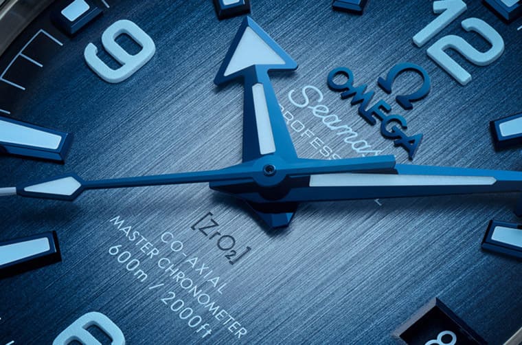 Planet Ocean 600米採用蓝色陶瓷表圈搭配潜蓝色刻度,面盘的夏日蓝色调经过垂直拉丝修饰后展现专业潜水表的粗獷霸气,至于手表的指针还经过蓝钢处理,搭配潜蓝色的夜光物料相得益彰。