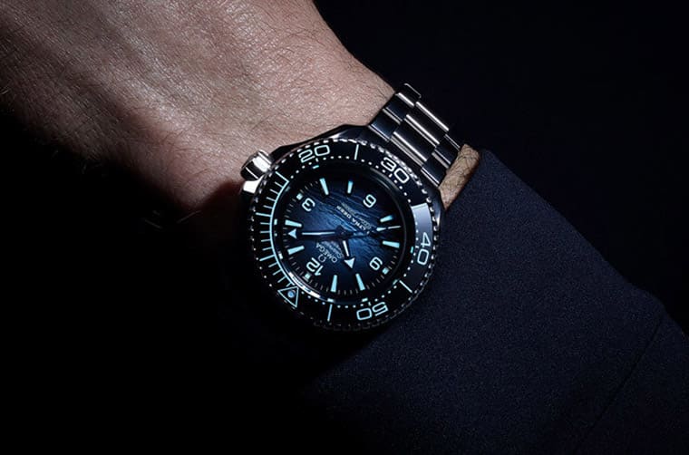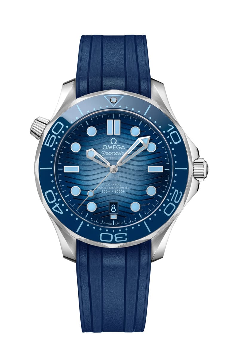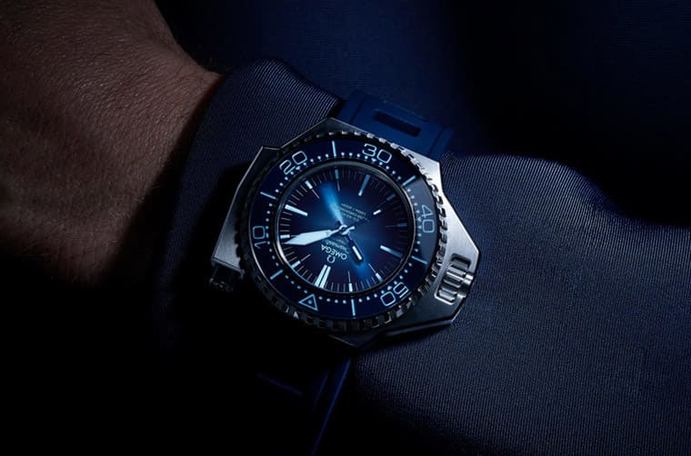 这次的海马Summer Blue手表收罗了系列中不同防水等级的手表,最少150米,最多则达6000米,堪称欧米茄研发防水技术的精华缩影。而品牌为了强调系列的整体感,因此统一在这系列作品中挹注三大共通元素:
