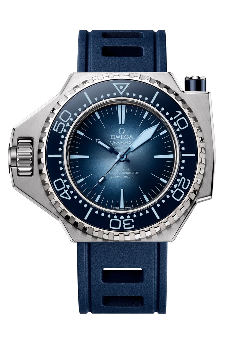 外型在海马系列旗下相对独特的Ploprof 1200米改换O-MegaSteel再出发,搭配蓝色陶瓷圈、表壳2点钟位置的安全按钮也镀上深蓝色以呼应手表的夏日蓝主题,包括它换上的穿孔橡胶表带也以蓝色呈现,深邃的色调和手表超高防水性能彷彿也有互相辉映的深意。