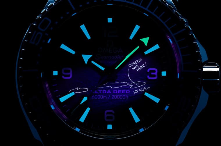 Planet Ocean 6000米系列Ultra Deep是欧米茄研发潜水表的尖端技术总成,有鉴于这款表的原型曾在2019年缔造深潜世界纪录,所以这次欧米茄才会在面盘加上挑战者深渊图案,而当手表接触紫外线时,还能清楚看到挑战者深渊的地形轮廓(包括西渊、中渊和东渊等)、打破纪录的深度数据(10,935米)以及”OMEGA WAS HERE”字样,不仅承袭Summer Blue的主题,还将手表的创作来龙去脉做了更具体的交代。