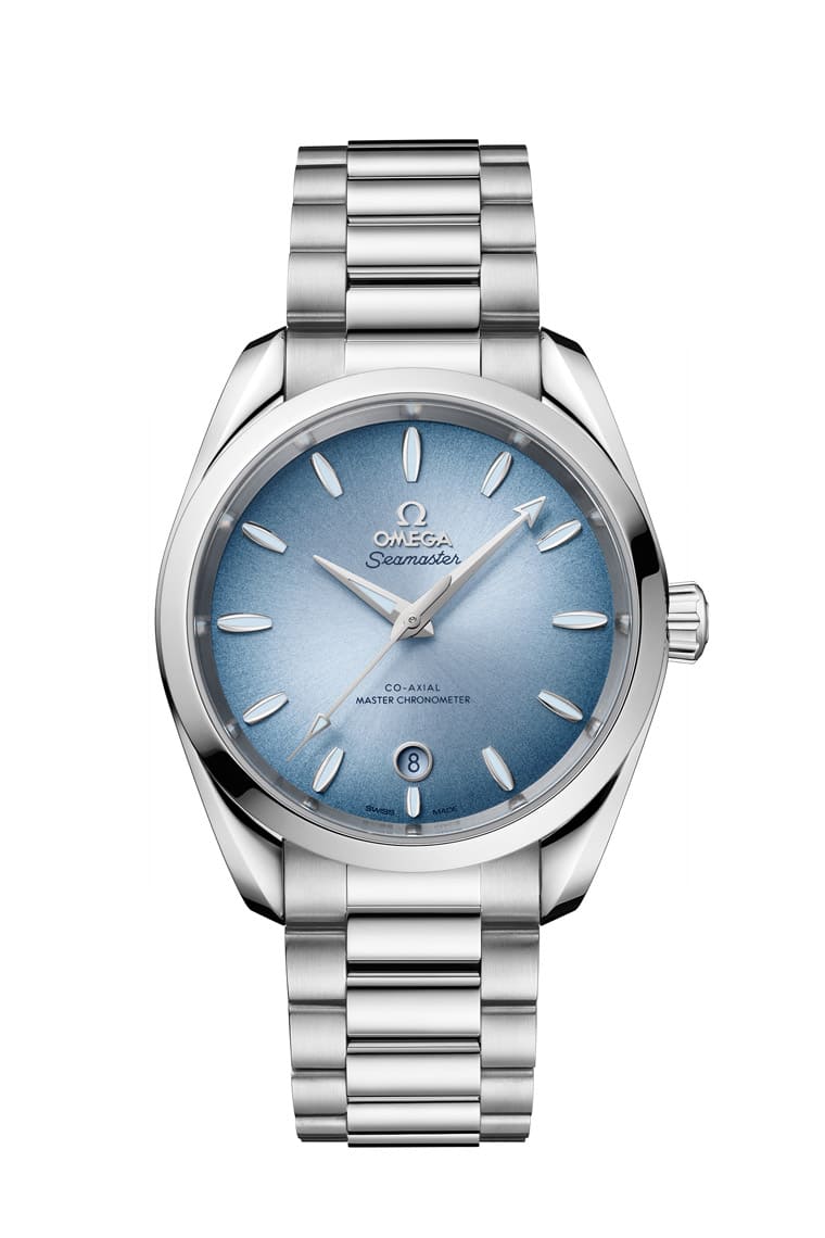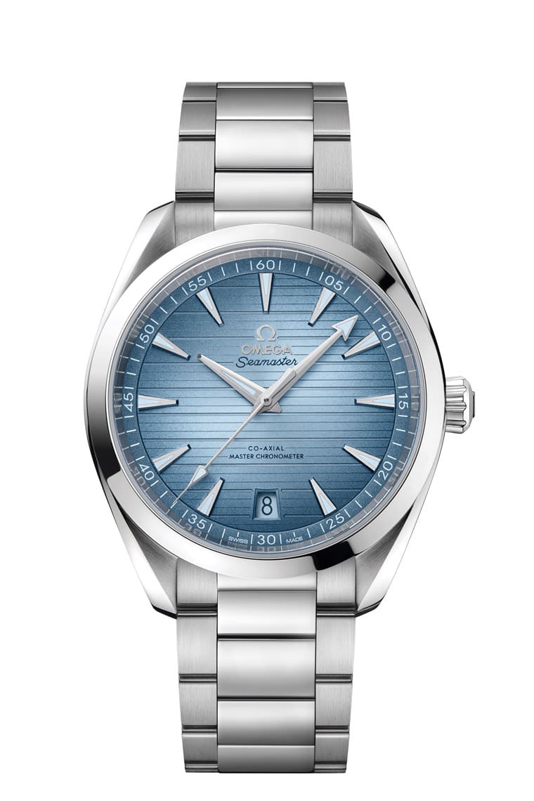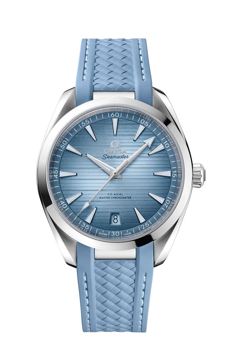 在150米防水等级中分别有海马Aqua Terra 150米38毫米手表、海马Aqua Terra 150米41毫米手表以及海马Aqua Terra 150米系列43毫米世界时区手表等三款作品。Aqua Terra 150米38毫米手表採用渐层蓝色的太阳线纹磨砂面盘,它的6点钟日期窗也改成了浅蓝底黑字设计。至于41mm的Aqua Terra 150米的水平甲板纹夏日蓝面盘先经过太阳线纹磨砂和PVD处理,接着还会覆上亮漆收尾,这款除了有不锈钢链带,也还有浅蓝色橡胶表带款式可选。前不久也才刚出新款的Aqua Terra 150米系列43毫米世界时区手表也共襄盛举出现在这次的Summer Blue主题中,面盘中央的钛金属用雷射蚀刻出蓝色的海洋以及米灰色调的陆地轮廓,而在地球图案周围的24小时刻度也换成浅蓝色和深蓝色分别表示白天与黑夜。