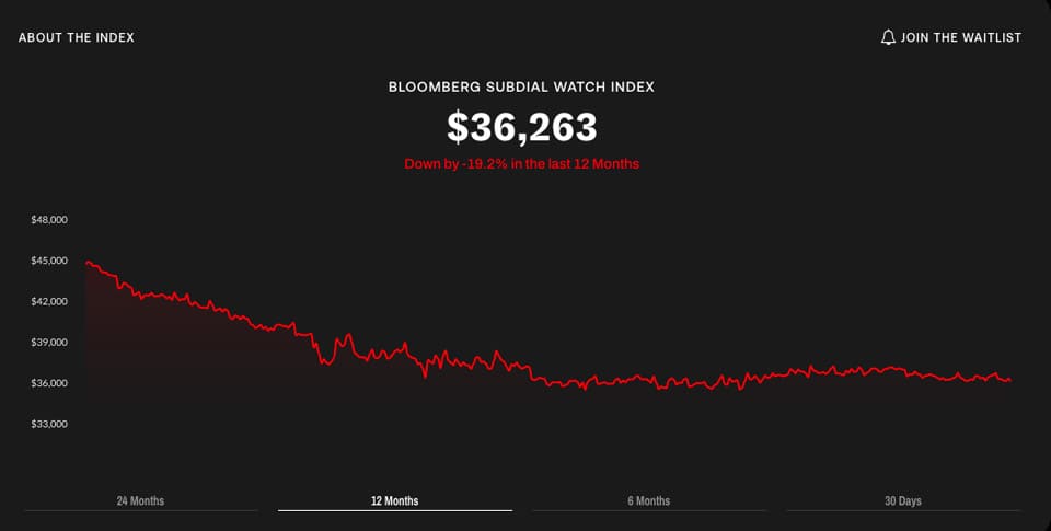 ▲最新公布的Subdial 50指数,目前高级手表的平均价格为36,263美金(约合台币112万),比一年前下跌超过19%。Source:Subdial