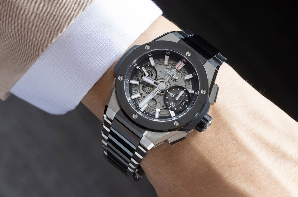 钛金属、陶瓷材质/HUB1280自动上链机芯/时、分、小秒、日期显示/计时码表功能/蓝宝石水晶镜面、透明底盖/防水100米/表径42mm/参考价:NT$ 749,000