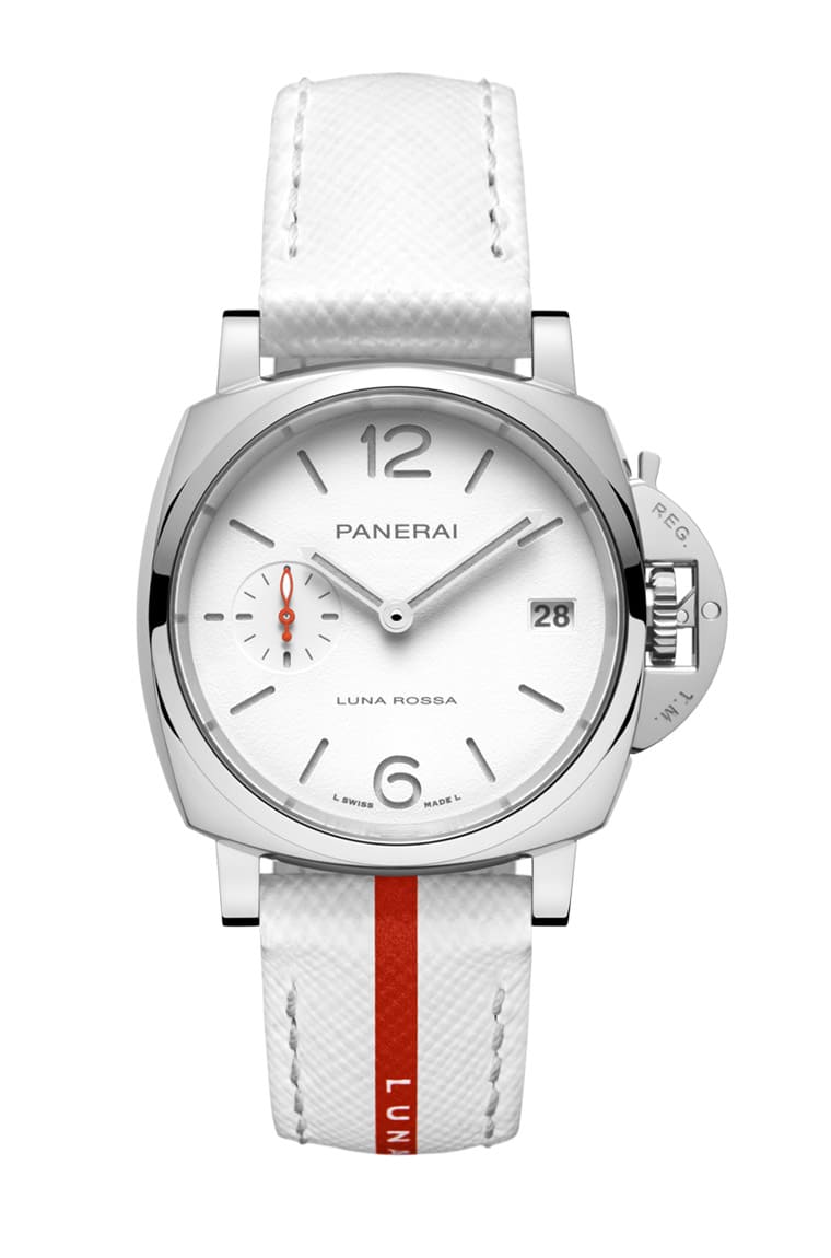 新系列的Luna Rossa特别版有些共同特徵例如以深海蓝色或白色与Luna Rossa帆船队官方红色激盪出耀眼火花,首先看到的是最基本的小三针手表,包含PAM01378、PAM01381与PAM01408等,前两者都是以Luminor Due系列为基础,PAM01378採用不锈钢材质制作38mm的表壳,搭配白色Saffiano皮革表带,表带饰有”LUNA ROSSA”字样的红色条纹;PAM01381同样是不锈钢材质,不过表径扩大至42mm,并搭配灰色双材质表带(同样有”LUNA ROSSA”的红色条纹)。