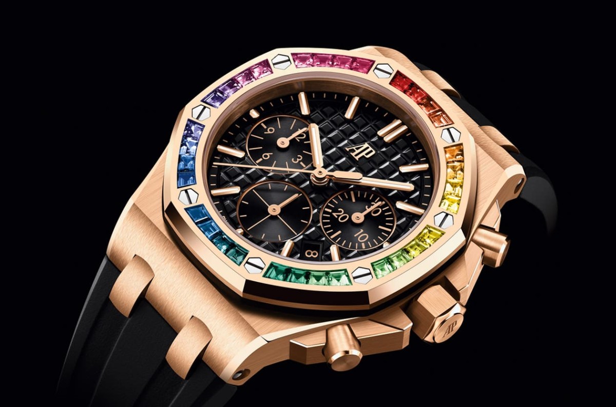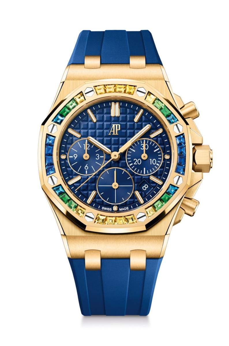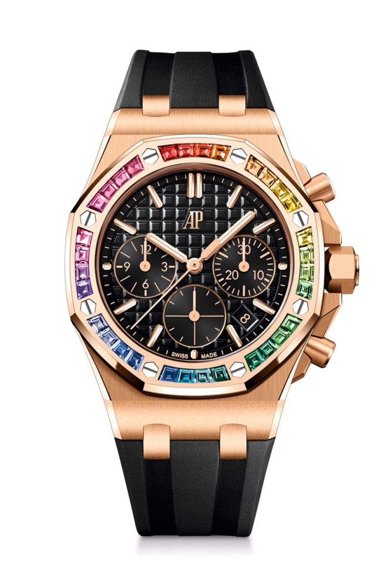 表圈镶嵌彩色宝石的款式有玫瑰金与黄金两款,爱彼AP改用隐藏式镶嵌工艺于表圈镶上32颗宝石,其中玫瑰金款表圈镶有红宝石、沙弗莱石、黄玉、坦桑石、紫水晶和各色蓝宝石,形成七彩繽纷的炫目效果,配合黑色面盘及玫瑰金色指针与时标相得益彰,包括橡胶表带也是黑色。黄金款表圈镶嵌的宝石主要为沙弗莱石与黄、蓝色蓝宝石,搭配宝蓝色面盘、金色指针与时标,橡胶表带和面盘维持同色系。巧妙的色彩搭配使得四款腕表活力四射地绽放Royal Oak Offshore皇家橡树离岸型系列风靡30年的设计美学。