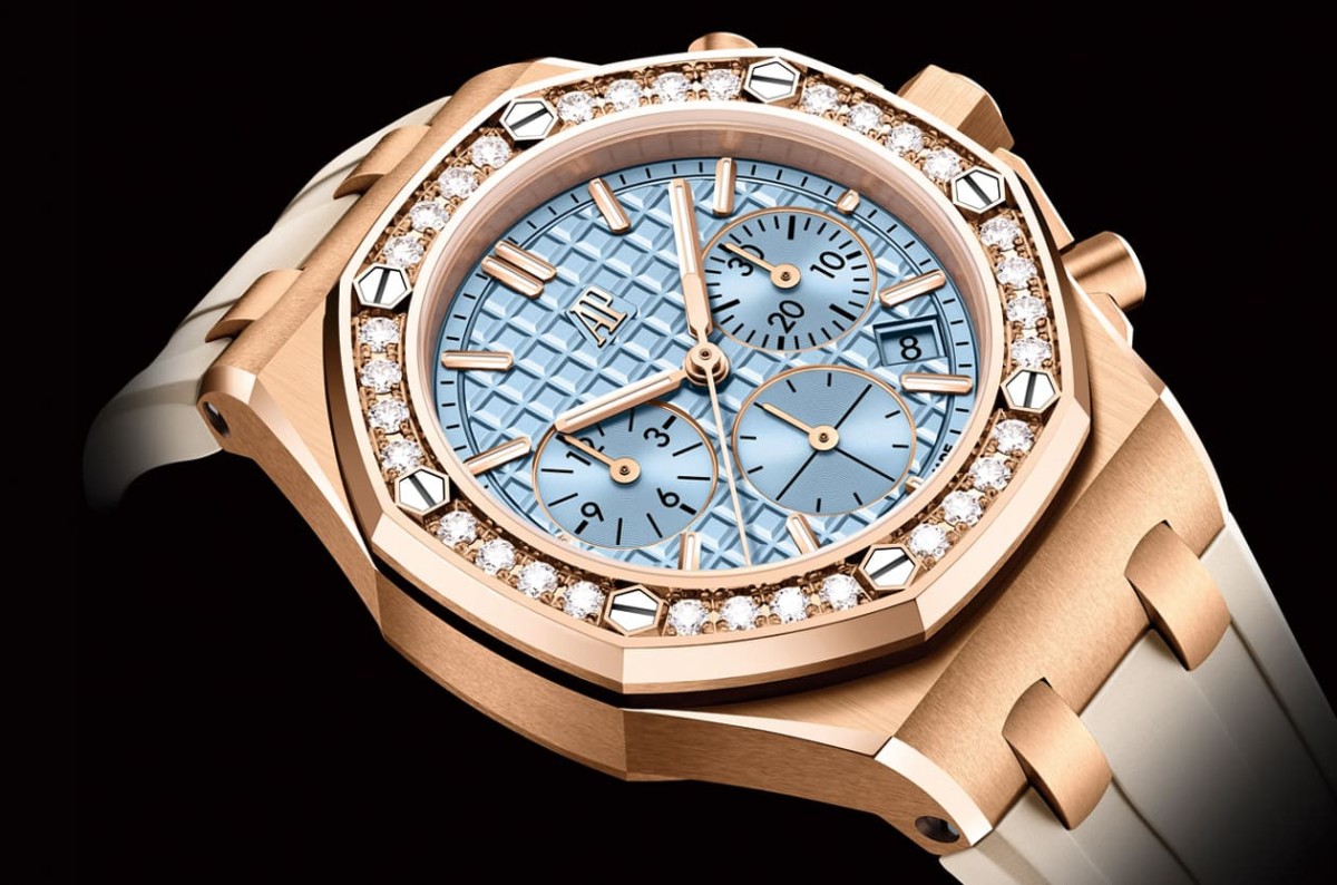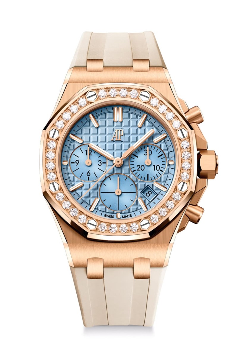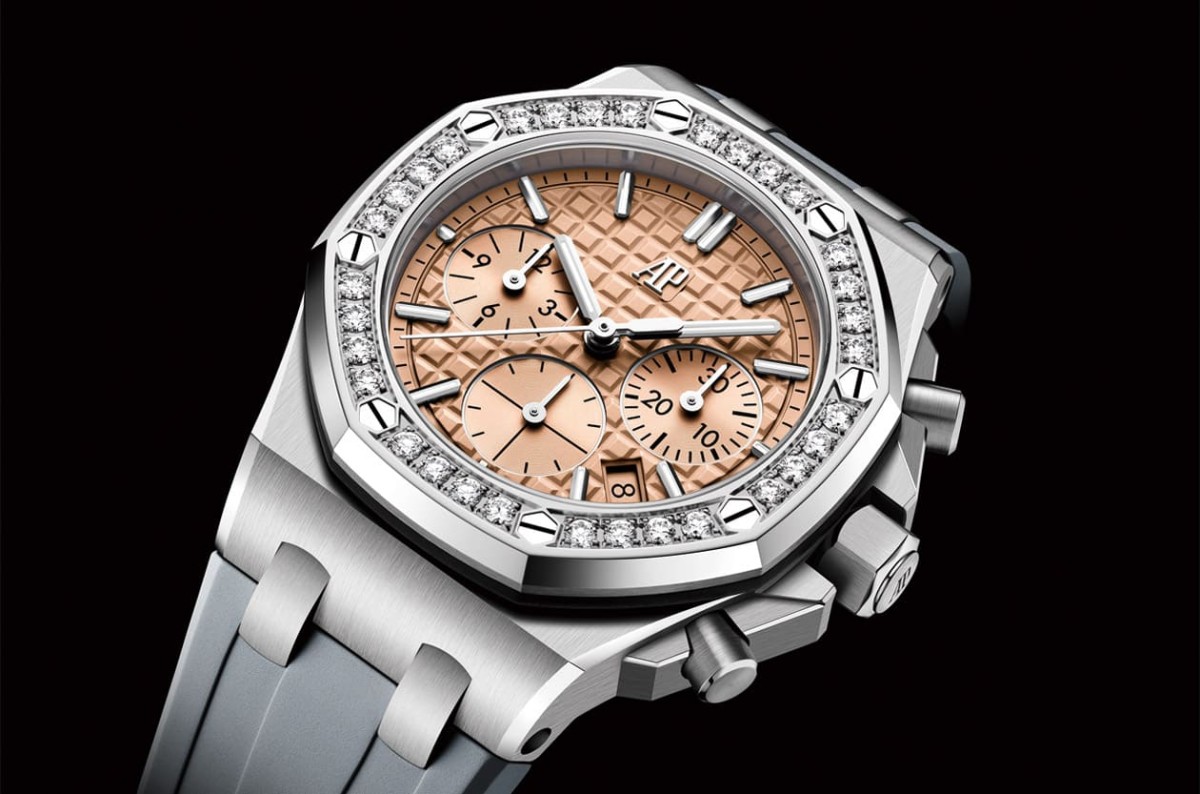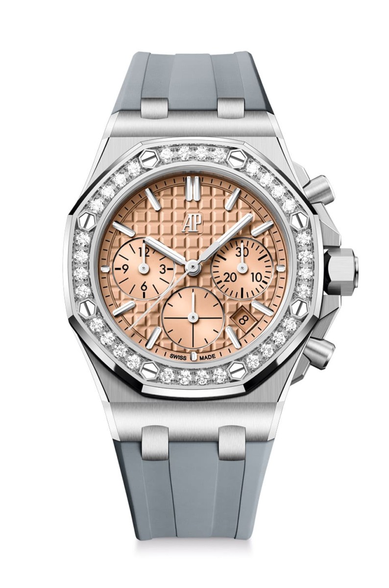 确立新式的设计细节之餘,四款Royal Oak Offshore皇家橡树离岸型37毫米自动计时码表採用的材质、配色以及宝石等各方面都不尽相同,大致而言可概要分成镶嵌明亮式切割钻石与长方形切割彩色宝石两大类。前者分别有精钢及玫瑰金款式,两款皆以爪镶工艺于表圈镶上32颗钻石,其中精钢款搭配浅灰色橡胶表带,面盘为温润的鮭鱼色,其指针与时标与表壳呼应採银白色调;玫瑰金款搭配的是米色橡胶表带,面盘以浅蓝色调与玫瑰金色的指针和时标形成对比,强化读时清晰度。
