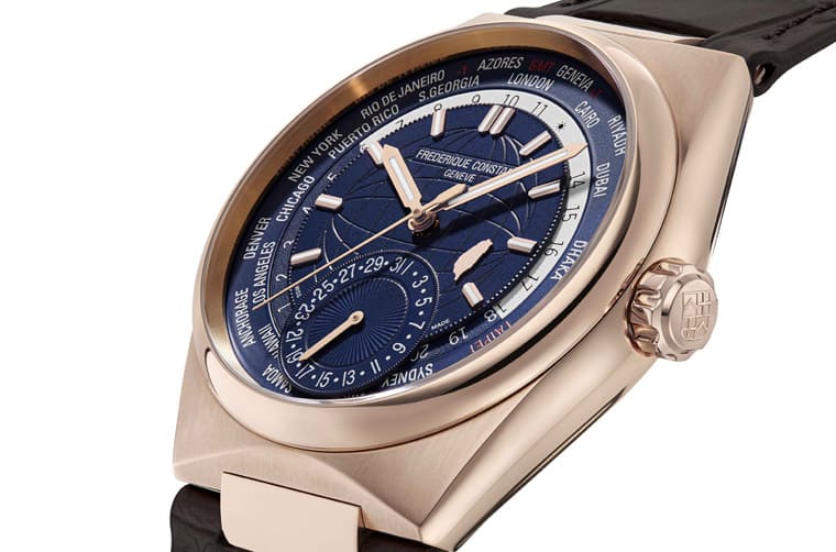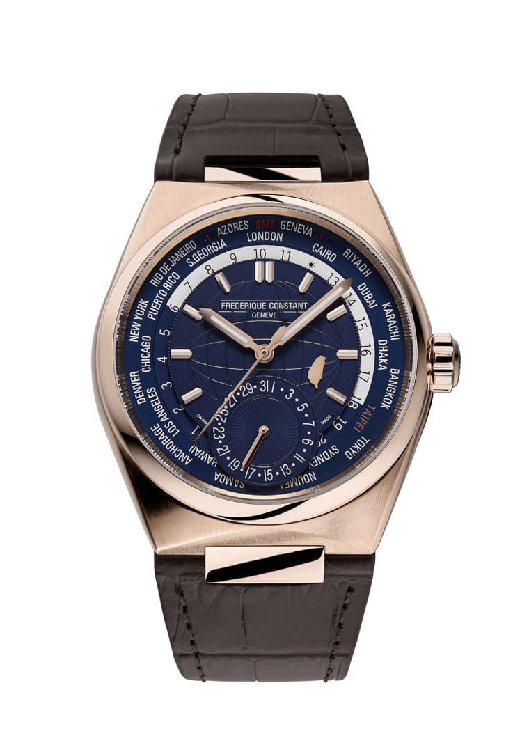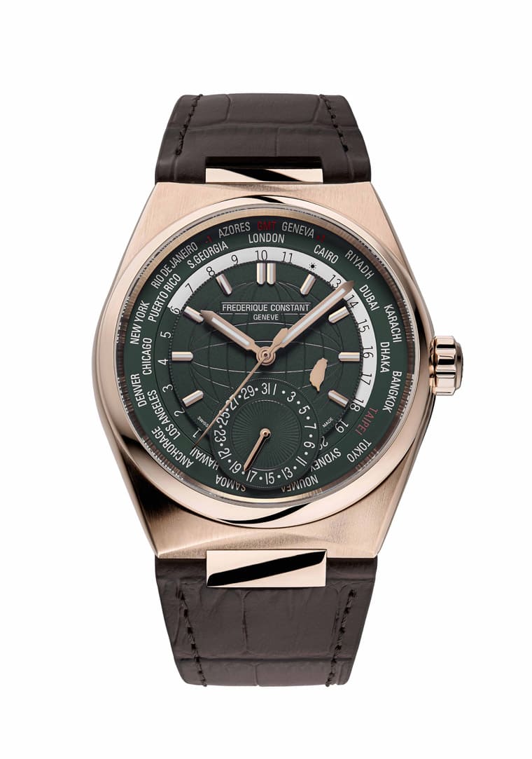 18K玫瑰金材质/FC-718自动上链机芯/时、分、秒、日期显示/世界时间显示/蓝宝石水晶镜片、透明底盖/防水30米/表径41mm/蓝色与绿色面盘各限量10只/参考价:NT$ 880,000