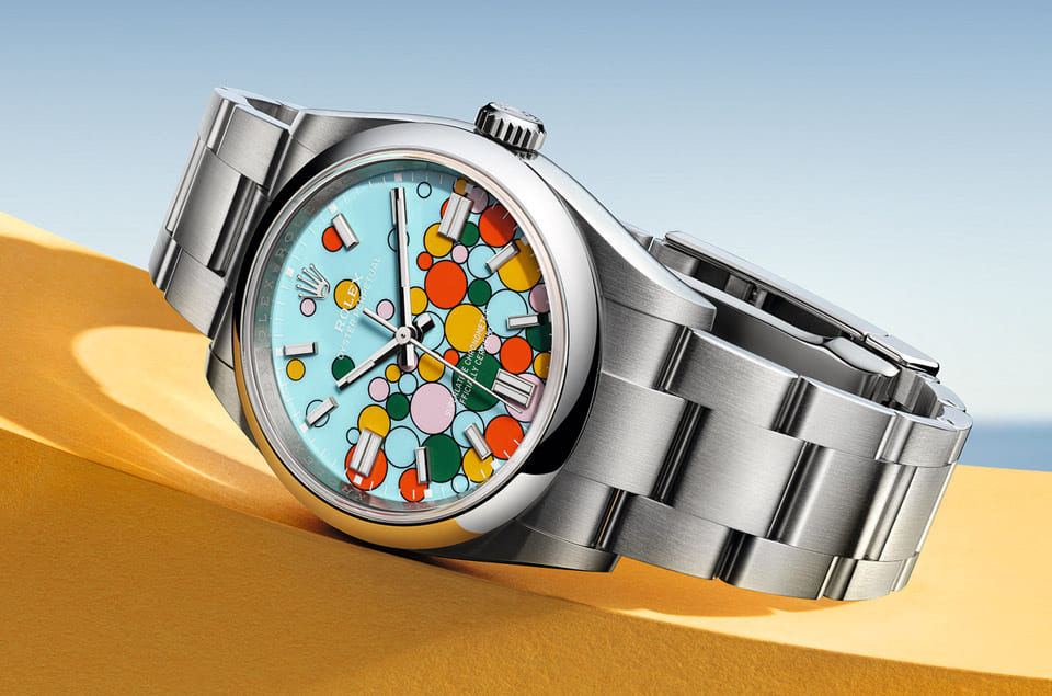 Oyster Perpetual彩色气泡面盘奠基于劳力士2020年发表的OP彩色漆面款式,后者从2022年开始逐渐减少款式数量,像是41mm这个尺寸现在就只剩绿色的彩色漆面这个唯一选择,结果品牌2023年打造的彩色气泡面盘背景底色运用了大获市场喜爱的绿松石色,并在上面圈出大大小小的黑色圆形轮廓,然后又分别涂上糖果粉红色、黄色、珊瑚红色、绿色等四种顏色,有点像是OP彩色漆面的集大成版本。手表问世后有人觉得面盘顏色变多,看起来更赏心悦目;也有的人则是认为之前单色的设计比较纯粹优雅,不会像彩色气泡有种抓不到视觉重心的感觉。