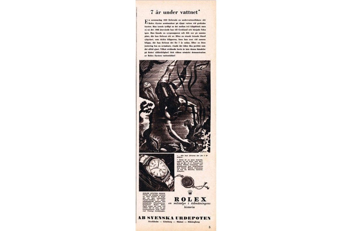 当他潜到当年事发的海底时,他却只花了一点时间就在海草丛生的石块角落中找到自己当年失落的那只劳力士手表,完全出乎他的意料;令人惊讶的是,当手表拿上岸稍事整理、擦乾后,它竟然还能够运作,并没有因为在水裡待了那麼长的时间就整个报销,这个故事后来传到劳力士耳中,等又过了10年之后,故事被劳力士当成了广告题材,用意在于强调他们家产品的防水性能与品质,在真实情境中的确能发挥在品牌研发时所预期的作用,无形中让人看了对劳力士手表又更有信心了。