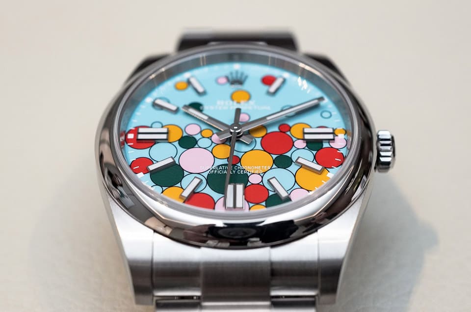彩色气泡面盘OP加入了多种顏色的漆料后,犹如TIFFANY蓝面OP的彩色升级版,刚好近年高级表市场对这种色彩饱满的设计非常有爱,所以在这个热门表身价普遍往下坠的时代,彩色气泡面盘OP行情还真的有点像面盘的泡泡一般直接腾空飞了起来,逆风高飞的表现让人惊呆。