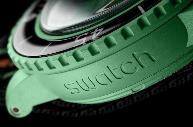 ▲表壳左侧刻有SWATCH品牌名称,生物陶瓷表圈上与五十噚类似覆上一层生物源材质镜面。
