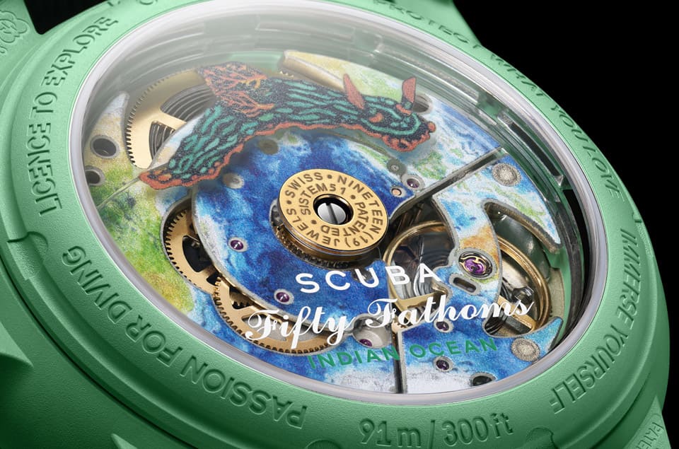 Bioceramic Scuba Fifty Fathoms手表和MoonSwatch还有个不同之处在于前者搭载的机芯改成了Sistem51自动机芯,而非石英机芯。Sistem51是SWATCH十年前推出一鸣惊人的作品,标榜生产过程全自动化生产、机芯零件只有超精简的51枚、动力储存可达90小时,而且现在版本的Sistem51已导入了Nivachron™游丝,赋予机芯更佳的抗磁效果。在手表背面的Biosourced生物源材质镜面下,可见Sistem51基板都印有手表代表大洋与其周边陆地的图案,SWATCH还会在五款表的自动盘上印上来自五大洋所发现到的裸鳃类动物(Nudibranchia,广义上俗称的海蛞蝓),以下再一一列出给大家参考