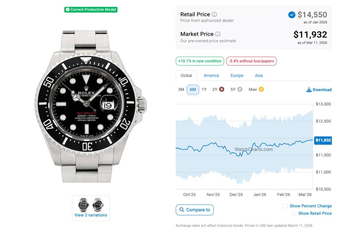 而在过了半年左右的现在,同样由WatchCharts观察到的海使系列市场价格曲线,我们会发现两款表走跌的情况逐渐缓和,近期它们的发展大同小异。目前126603仍旧处于定价以内(国外最近报价是15,313美金,约合台币48万6),126600也是已经好长一段时间都维持在定价以下,跨年前后开低走高,接着到目前身价都变化不大,行情微微回升至11,932美金(约合台币38万)。后者在2025年了6、7月后持续下跌,8~9月之际曾稍微涨上来,接着到12月中下旬逐渐下滑,如今有点触底反弹的味道;至于前者2025年从6月中旬到8月价格一度有回升,9~10两个月后先跌后涨,11月至2026年2月则是开低走高,不过3月后行情又跌了下来,回到接近去年12月的水准。