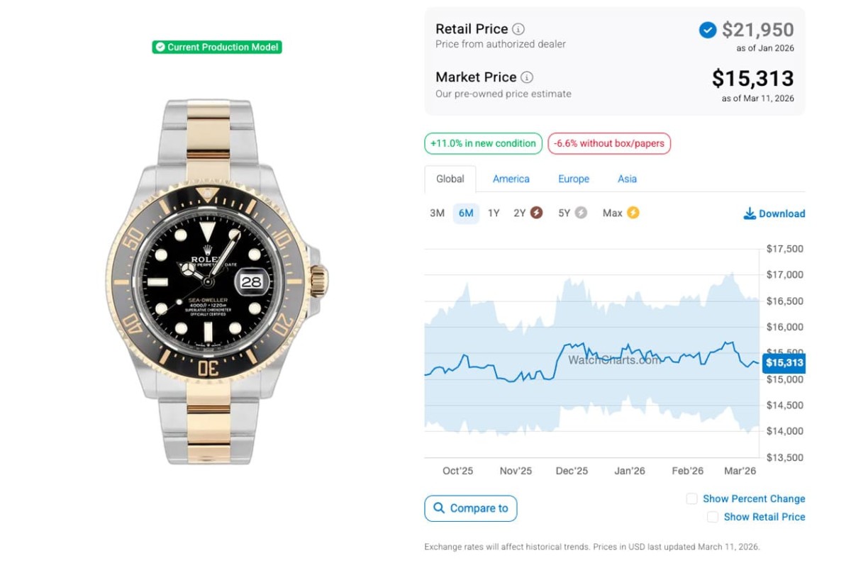 根据高级手表市场调查研究机构WatchCharts的资料,不锈钢表壳的126600在2025年9月时,行情还有11,717美金(约合台币37万2)的水准,但当时已经跌到定价以内;此外半金表壳的126603那时行情也早已经滑落到定价以下的15,085美金(约合台币48万),从二级市场报价中可以看出两款海使的确不算是热门度高的劳力士,或许它们的43mm表径和15.5mm表壳厚度对市场而言还是戴起来负担相对重一些,所以也多少反映在手表的二级市场价格上。