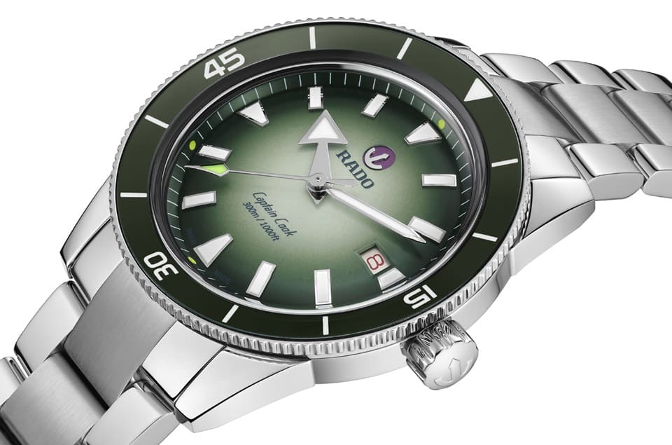 面盘呈现由中央往边缘、从白色过渡到绿色的迷人色调,上头镶有几何造型时标,搭配大型的时、分指针,不论时标或指针表面都涂覆白色Super-LumiNova®夜光涂层,至于秒针针尖则改採深黄色Super-LumiNova®夜光涂层,同样的夜光涂层顏色也出现在3、6、8与12点方向时标上缘,这其实是雷达表为了传达Cameron Norrie网球明星的身份所埋藏的设计梗,一来深黄色是对应网球顏色,同时它们出现在3、6、8与12点方向的位置也跟网球计分时採用的”15/30/40/Game”模式有关,从中展现出这款限量表与一般库克船长不同的意义。