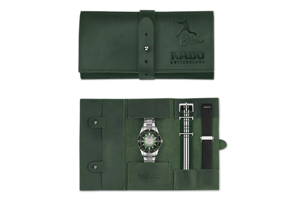 库克船长 x Cameron Norrie限量表会附上一只绿色皮革收纳袋,表面印有这位网球明星挥拍的英姿剪影与签名字样,而且由于雷达表还会多附一条黑色皮革表带和一条绿白相间的NATO织物表带,所以佩戴者能够把备用表带放进绿色皮革收纳袋中,重点是手表本身具备品牌研发的EasyClip表带快拆系统,出门带上备用表带随时想换表带就可以更换,展现出手表多元且多变的搭配灵活性。