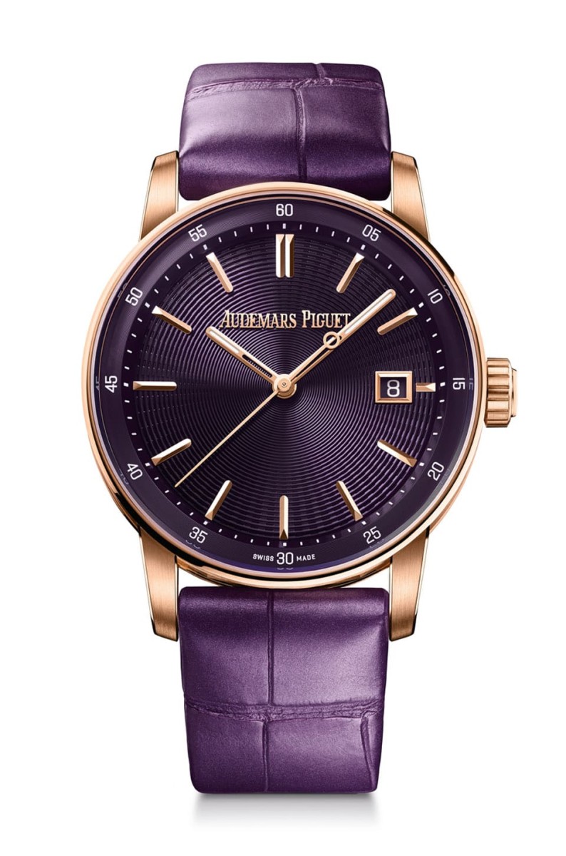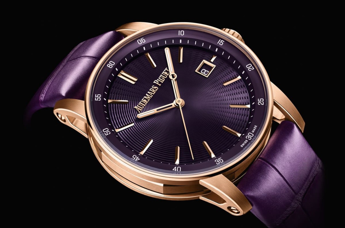 面盘部分,新款CODE 11.59自动表分别有紫色与象牙白色两种版本,爱彼分别替它们搭配与面盘同色的鱷鱼皮表带,至于表扣乃是拥有专属此系列的AP标志针扣,在不容易注意到的细节上仍旧展现品牌一丝不苟的制表精神与态度。面盘两种顏色均辅以爱彼2023年替CODE 11.59新开发的纹路,其由品牌与知名机刻雕花师Yann von Kaenel共同设计,特色为面盘刻有上百个凹点,一一铺排成同心圆状,所以面盘最终看起来好像有水花荡漾开来,爱彼再透过物理气相沉积(PVD)镀膜于机刻面盘表面加上紫色或象牙白色。两款表的时标与指针皆为玫瑰金材质,且具备刻面与拋光处理,而且新版的CODE 11.59系列作品还在时、分针上涂上夜光物料,有助于提升手表的试读清晰度。