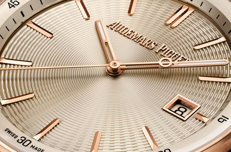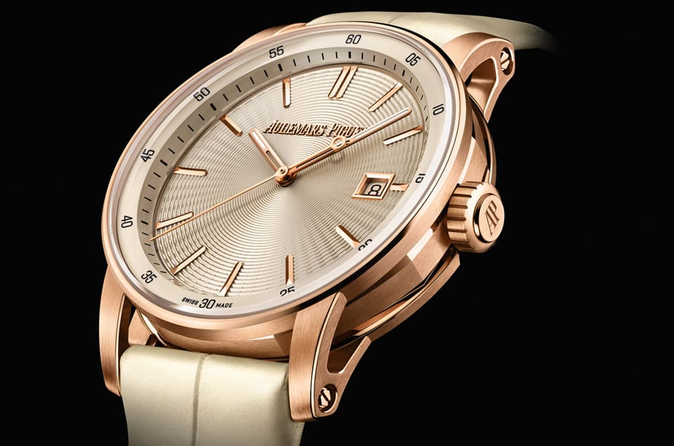 爱彼也讲究地在玫瑰金材质表面施以雾面打磨以及倒角拋光,如此能令手表造型随着光线照射更为突显。仔细看会发现新款CODE 11.59自动表的表冠好像也不太一样,原来这是品牌2023年改良后的新设计,大致上表冠侧边的凹槽纹路变得较浅却也更密,有助于增益佩戴者调校或上链时的手感。