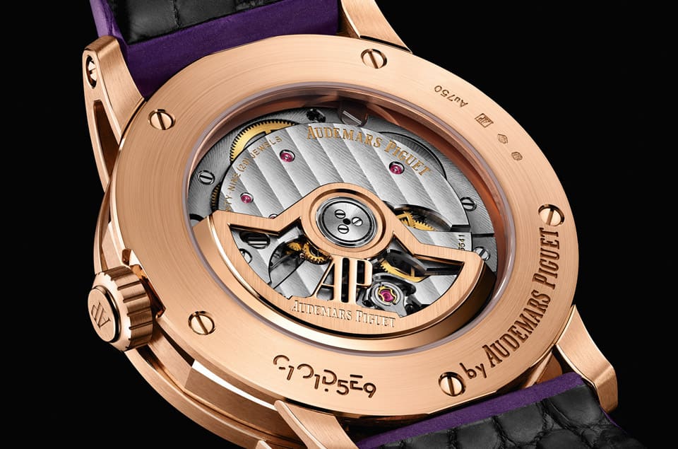 透明底盖露出的机芯与41mm CODE 11.59搭载的4302机芯不同,爱彼将2022年首度现身在37mm皇家橡树自动表的5900机芯移植到CODE 11.59系列中。这枚机芯的厚度为4mm、摆轮震频4Hz,动力储存有60小时。22K玫瑰金自动盘经过镂空处理腾下简洁的AP标志,佩戴者因而视野更开阔,可以细赏机芯零件上的日内瓦波纹、垂直缎面打磨与倒角拋光等修饰,高工艺水准用看得就能具体感受。