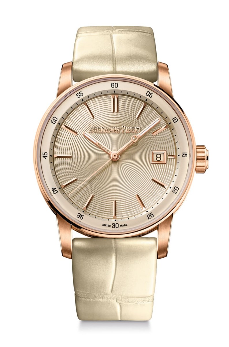 过去若对CODE 11.59系列感兴趣,还必须先考量自己的腕围戴起41mm这样的尺寸合不合适的问题,因此如果是腕围较小的人,爱彼新增加的38mm款式犹如久旱欣逢的甘霖。全新的CODE 11.59自动表採用玫瑰金材质,为了完整诠释系列的设计精髓,因此品牌重新调整过手表的线条比例,呈现在成品之中可见中层表壳依旧拥有向皇家橡树系列致敬的八角造型,表圈与底盖边缘则又是圆形,另外表耳焊接在表圈与底盖上,中间经过挖空处理,流露一股现代设计风格。