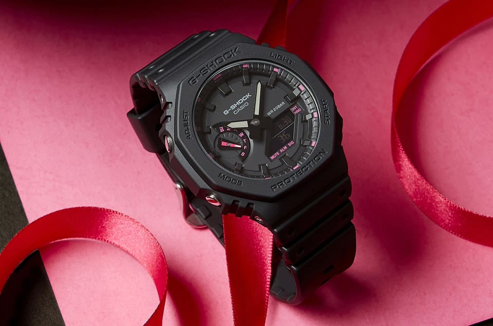 G-SHOCK奠基于GA-2100和它的缩小版GMA-S2100系列催生粉红丝带对表,其中GA-2100P-1A以All Black全黑设计示人,并在局部指针与刻度上点缀桃红色呼应主题,另一款GMA-S2100P-4A本身就偏向女表的设定,所以品牌乾脆直接用桃红色做为手表主色调,同时在按把和表带扣环等处採用金属零件以提升整体质感,另外手表的液晶萤幕部分则是红底白字,闪亮的芭比风让人第一眼印象超深刻。