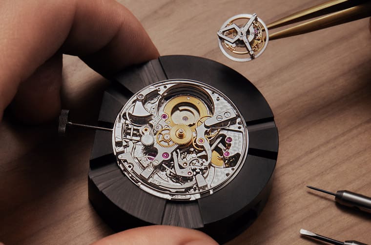面盘6点方向是每五分钟旋转一圈的陀飞轮装置,设计方面依循Rexhep Rexhepi的独特理念。陀飞轮框架内的摆轮搭载双宽臂,以及灵感来自航海天文钟的八个惯性调校砝码。至于这款机芯最独一无二的特色便是「自鸣计时(Chronographe à Sonnerie)」,这两种复杂功能过去从未在手表上成功整合在一起,因此对于当代表坛而言,绝对是一项厉害成就。