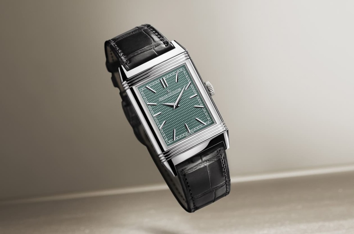 积家採用白金材质制作两款Reverso Tribute Enamel的表壳,它们都搭配黑色鱷鱼皮表带,正面的二针面盘最先映入眼帘的是先以手工机刻形成麦粒扭索饰纹,再以四至五层半透明的绿色珐琅覆于表面的造型(《木曾海道小野瀑布》款),制作过程约3~4小时;至于《和州吉野义经马洗瀑布》的面盘机刻纹路共由800道以上线条构成,且每道线条需要在车床上刻画5次(总计4,000次),光是这部分的工时就要8小时左右,后续也同样要涂覆半透明绿色珐琅至少四层,反覆上釉、烧制,积家会再花额外的8小时才能制作完成,因此《和州吉野义经马洗瀑布》款式的正面面盘制作难度相对更高。两款表的面盘都有轨道式刻度、刻面镶贴时标与太子妃式指针等元素,搭配面盘装饰工艺简洁俐落却又别具特色的展示时间推移的轨跡。