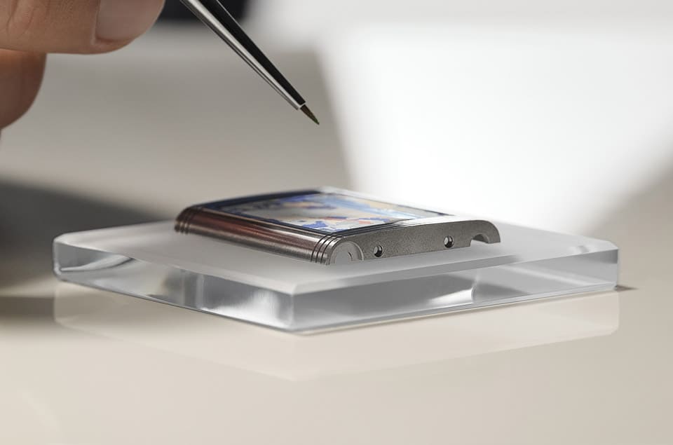 当不需紧盯时间或想要暂时放松、欣赏世界名画的话,只要将手表转到背面,就可以分别看到葛饰北斋笔下的名胜风景,品牌工艺师以过人经验与技法,将两幅浮世绘名作一笔一笔画在表背的矩形空间,每幅画作至少会涂覆十四层以上的珐琅釉料,每涂一层要先放入800℃的窑炉烧制,画好一幅《木曾海道小野瀑布》或《和州吉野义经马洗瀑布》都要至少80小时以上,其中最大的挑战即在于手表尺寸仅为原作尺寸的1/10,因此品牌工艺师要在这麼小的空间中重现原版画作的每一个细节,非常讲究观察力、绘画技巧以及对空间的掌握等,就连葛饰北斋当年写在画框顶部的题款,工艺师如今也藉由显微镜的辅助一一手写还原,尽力做到与原版画作近乎一致的境界,最终呈现在手表上的,也是和真实画作一样别具感染力的画面。