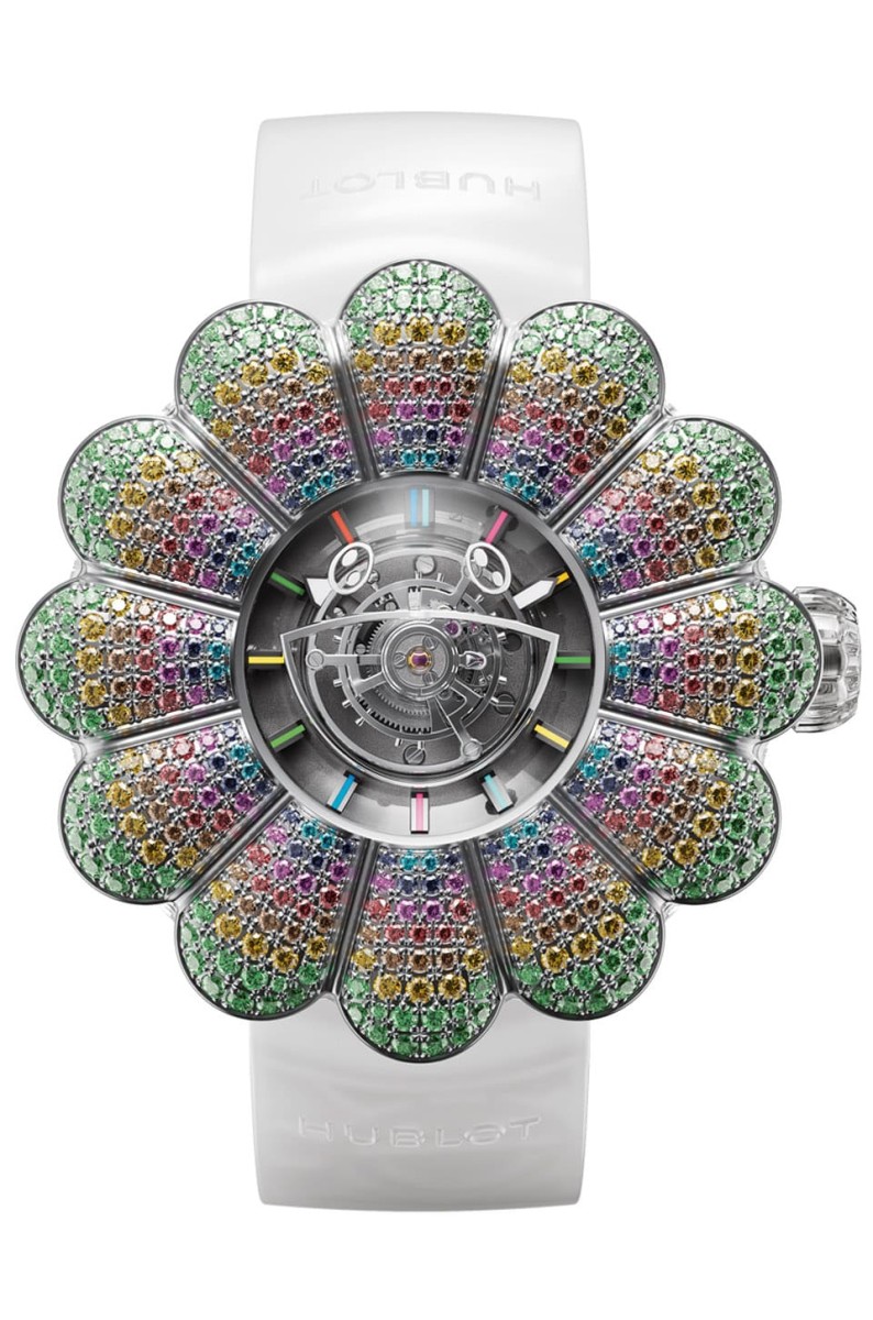 蓝宝石材质/HUB1214 UNICO自动上链机芯/时、分显示/3D花朵镶嵌487颗彩色钻石/蓝宝石水晶镜面、透明底盖/防水50米/表径45mm/限量100只/参考价:NT$ 3,270,000