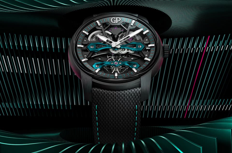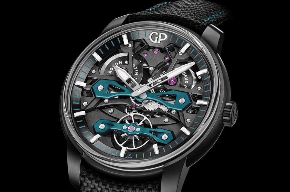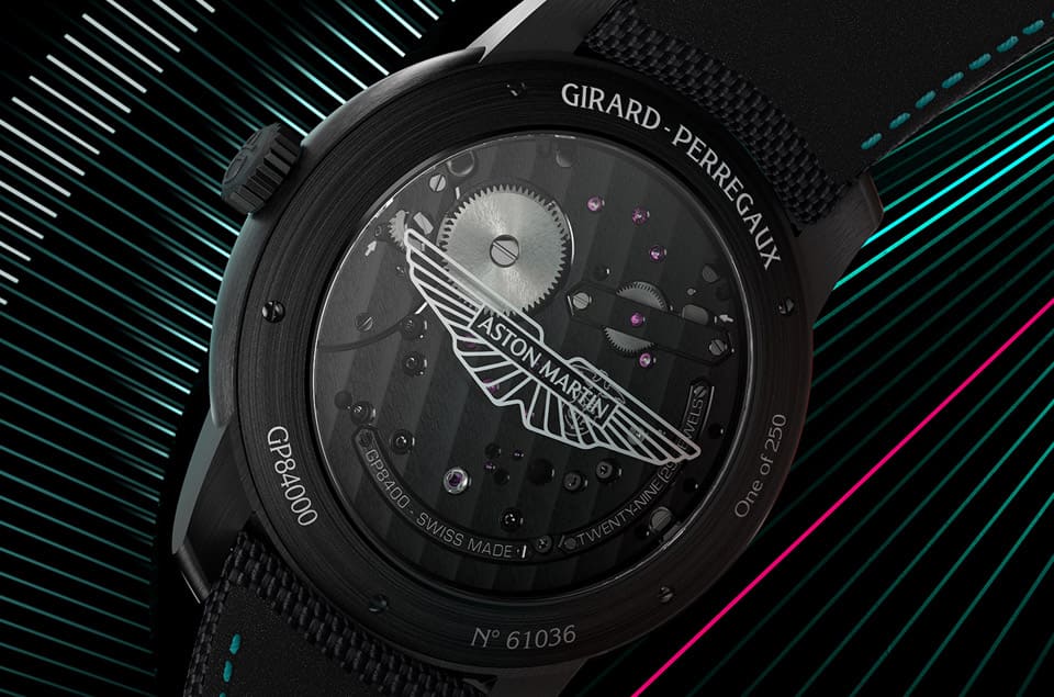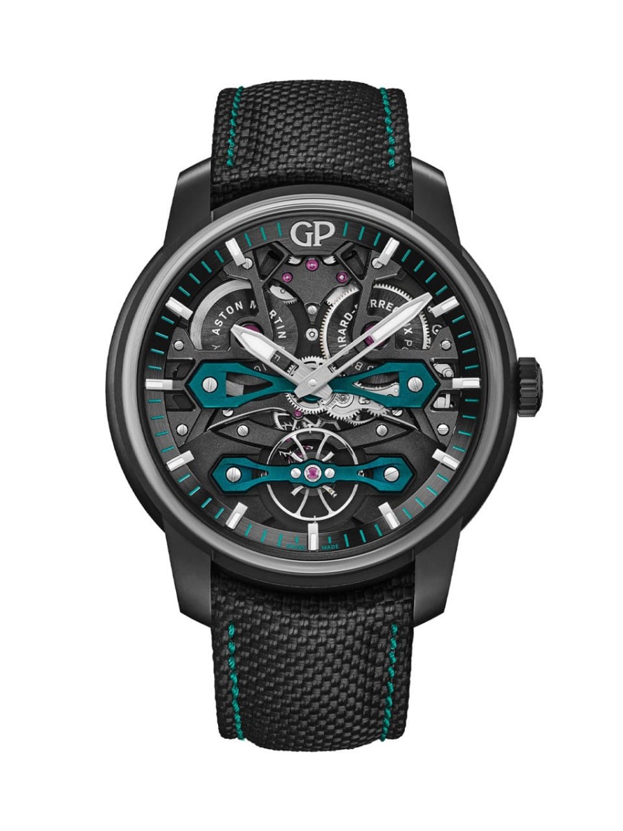 手表的开面设计呈现出镀黑的立体机芯结构,包括面盘外缘刻度,以及时、分指针和擒纵系统的金桥零件同样有翡翠绿车色点缀在黑色背景烘托下格外亮眼。面盘上半部可见大大的GP标志,其下则为并列的发条盒和微型自动盘,此次GP芝柏表也仿造DB12轮框后的制动器造型,将其转化成前述两部分的上层零件,从这些细节(包含配色)中巧妙点出手表的ASTON MARTIN联名表身份,低调却又特别地散发出吸引人的收藏价值。
