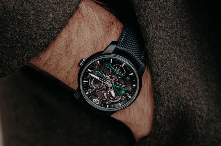 ▲品牌以ASTON MARTIN的DB12为灵感,从点缀手表细节的翡翠绿色可略窥两者的关联。