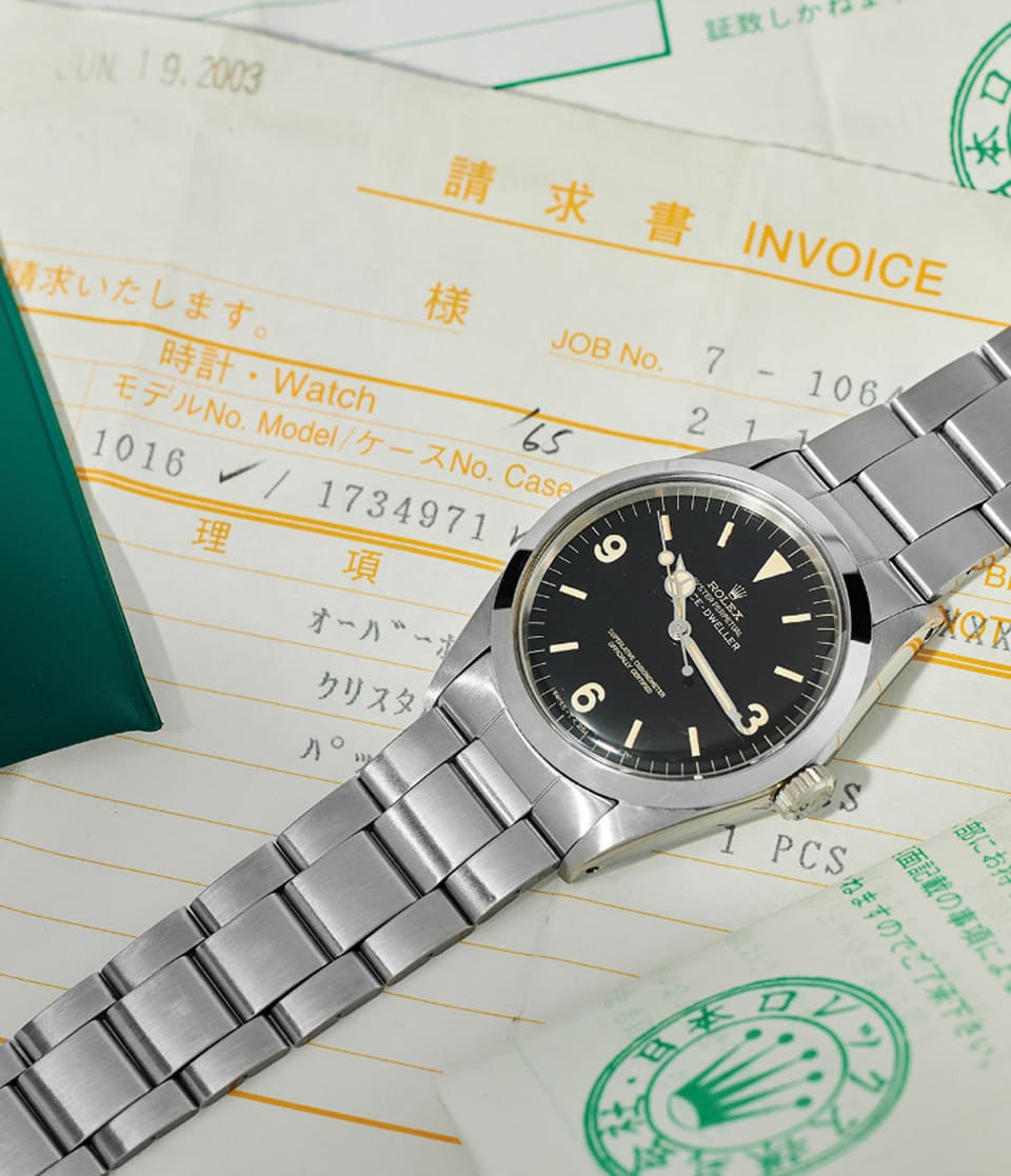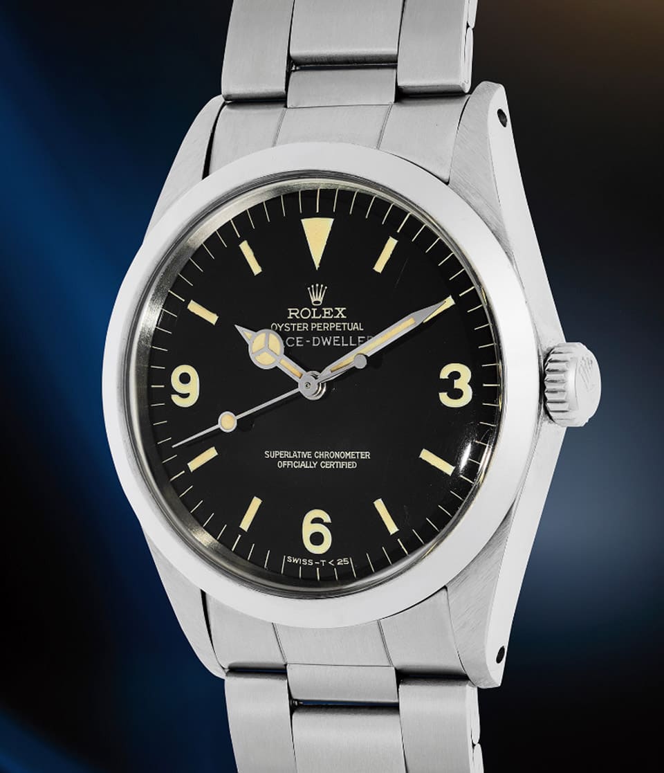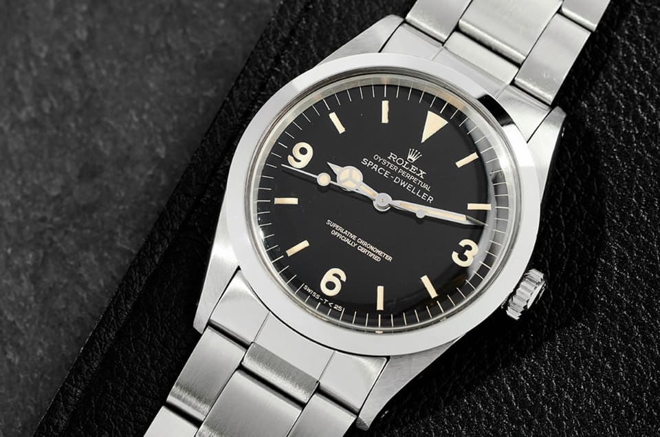 乍看Lot 23以为它是古董劳力士Explorer探一,事实上这款大约1967年生产的手表是叫”Space-Dweller”,它的诞生契机为1960年代劳力士积极想要打入太空领域的关键期,首款Space-Dweller于1963年登场,一开始它属于Explorer 1016这个型号,可见长得像探一不是偶然,而是两者真的带有一定渊源,而品牌显然是想用它作为基础,提供给太空人离开地球表面时佩戴,于是又把它改名为Space-Dweller,手表发表的时间点特别挑在水星计划太空人如John Glenn、Malcolm Carpenter等访问日本后,属于当地市场限定的作品,由于「太空使者」这个名称很响,搭配知名太空人造访的旋风的确达到了不错的宣传效果。