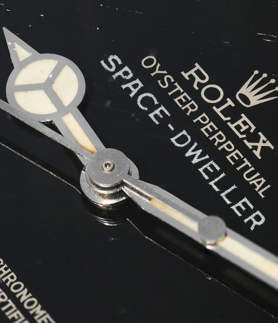 即将拍卖的Space-Dweller採用不锈钢材质,表径36mm和探一如出一辙,黑色面盘上的3、6、9点时标特别採用阿拉伯数字呈现,与其他方位的矩形或倒三角形时标有别,另外时标和指针上的夜光涂层为米黄色,虽然出厂后距今已经超过半世纪,但是整体看起来并没有严重褪色或变色,显然状态保存得宜。这款表在面盘12点方向印有独树一帜的”SPACE-DWELLER”字样,箇中蕴含日本市场限定的特殊意义,然而因为当年手表虽然一度引起关注,可是实际的销售表现似乎未如预期,因此从那以后也不曾见到劳力士用Space-Dweller的名称继续推广这款产品。